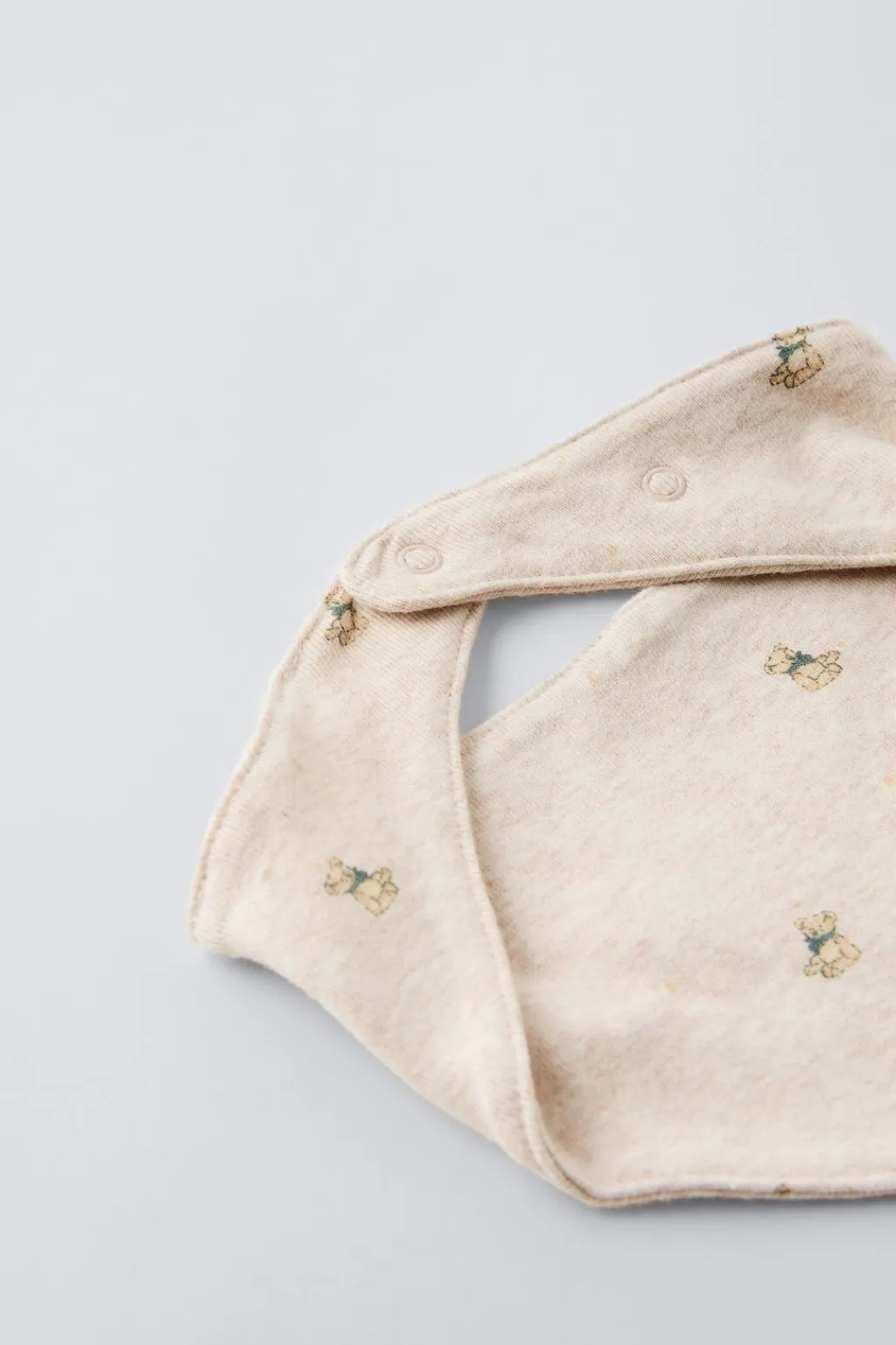 Set de dos piezas con estampado de ositos. Capota redonda con cierre en delantero. Bandana triangular con cierre ajustable con botones tipo presión.