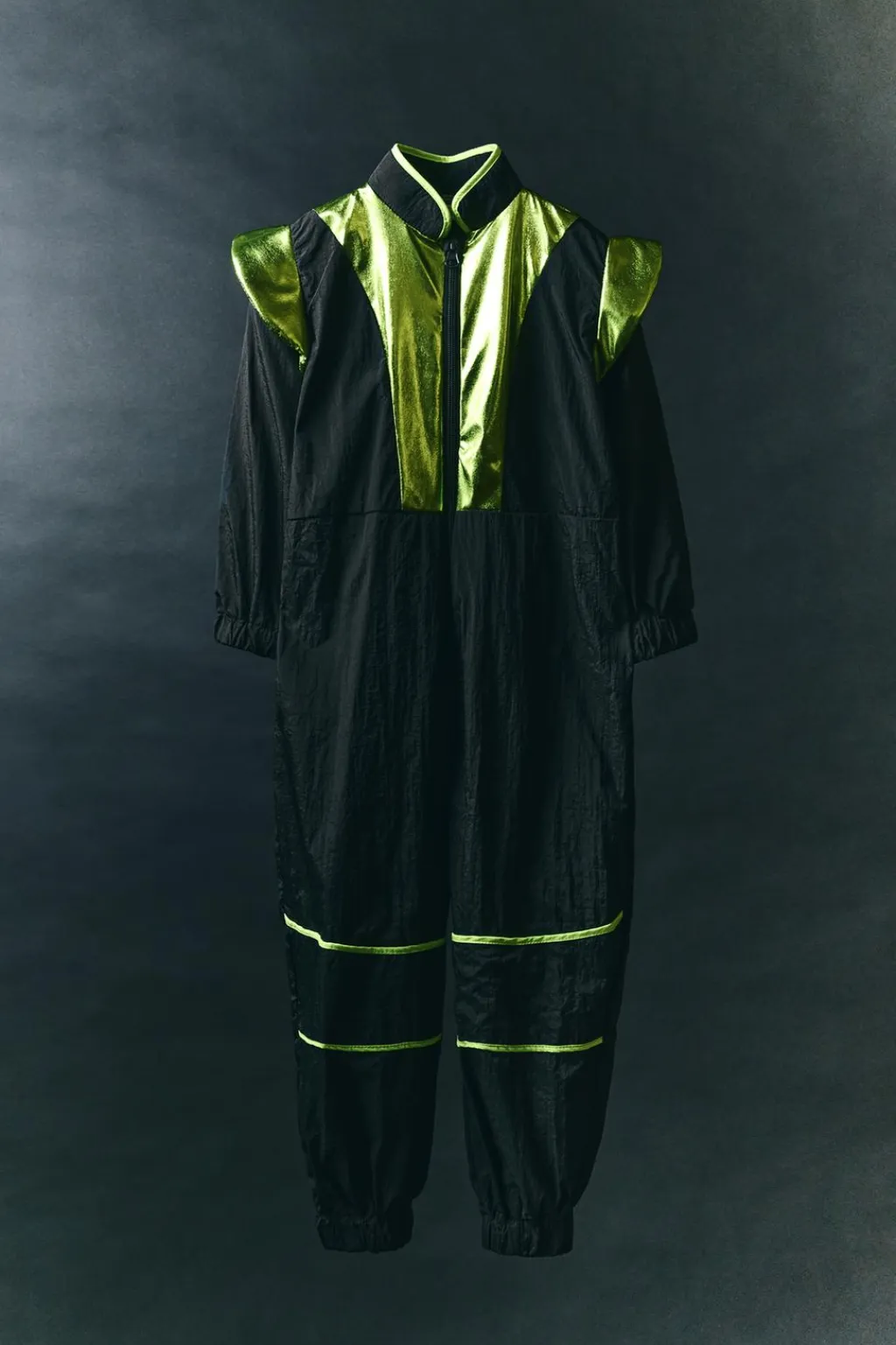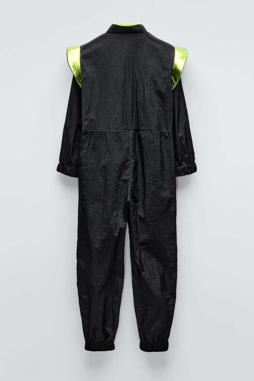 Mono con cuello subido y manga larga. Cierre con cremallera en delantero. Aplique hombreras tejido contraste.