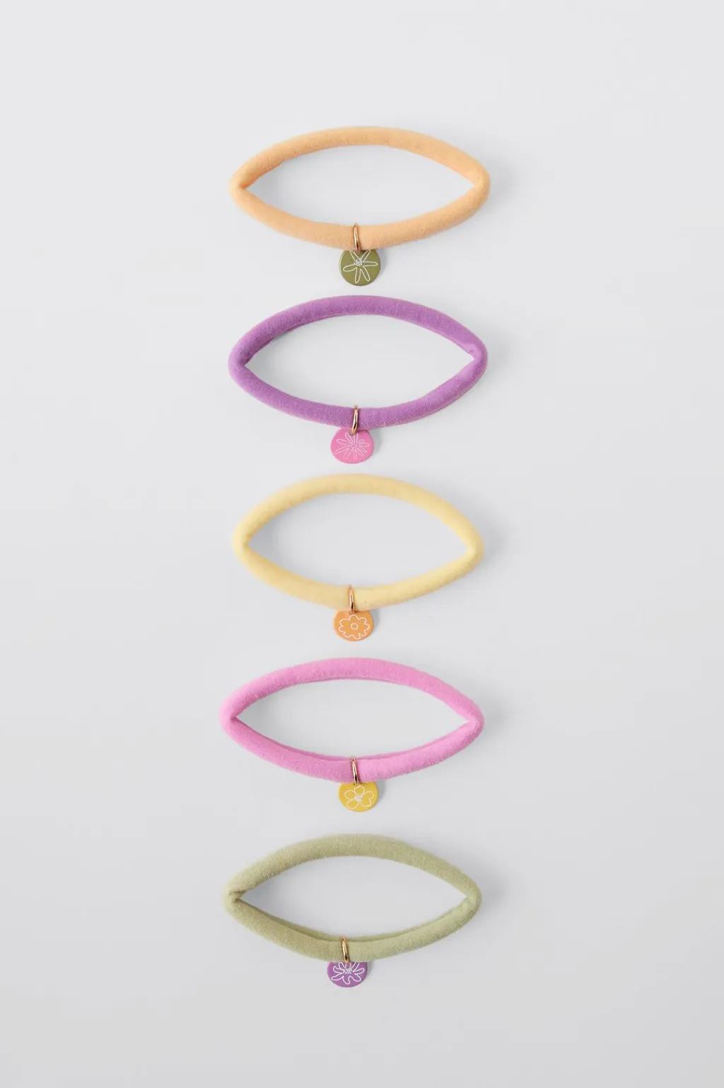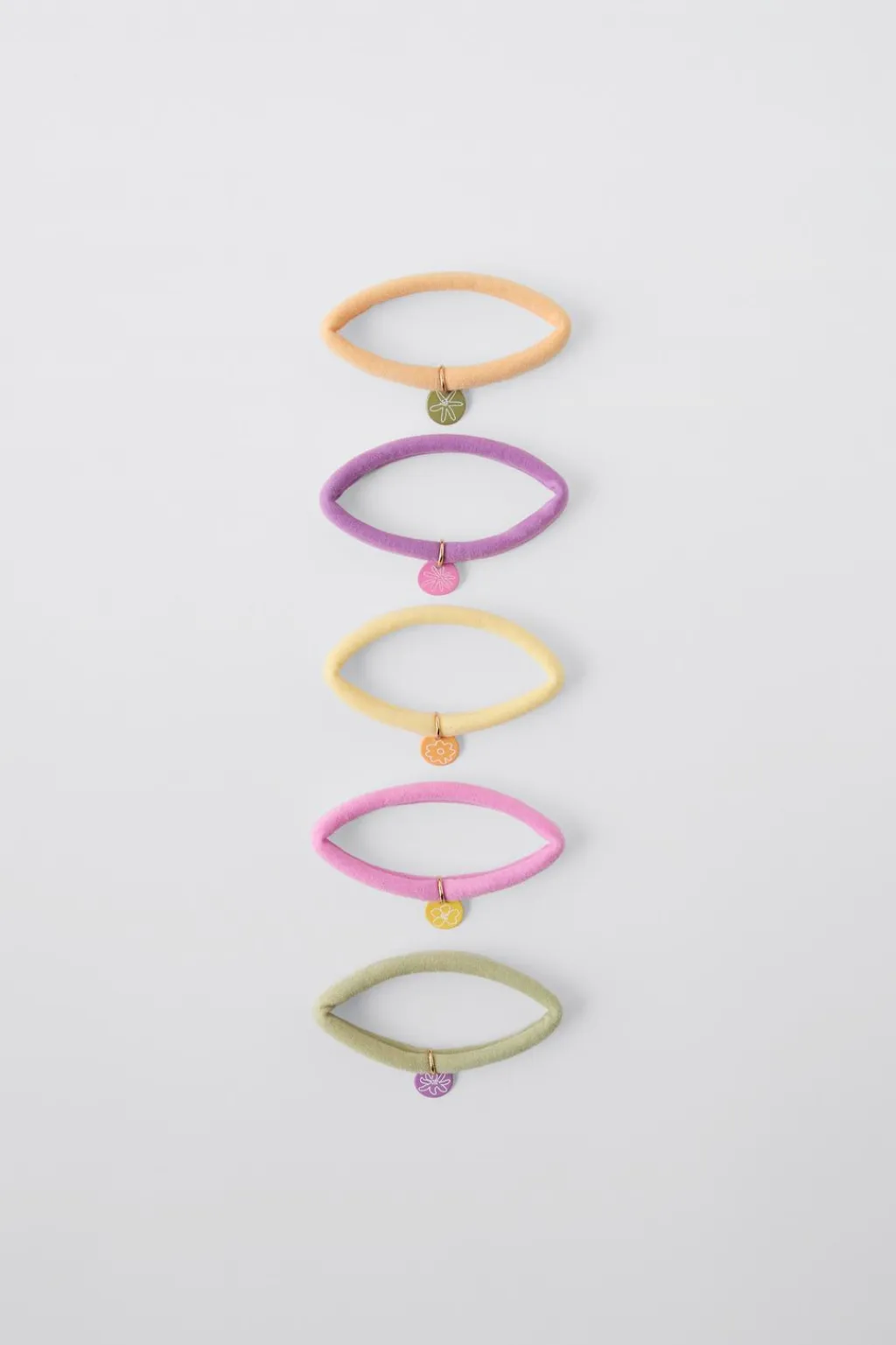 Pack de cinco gomas elásticas. Detalle plaquita con flor.