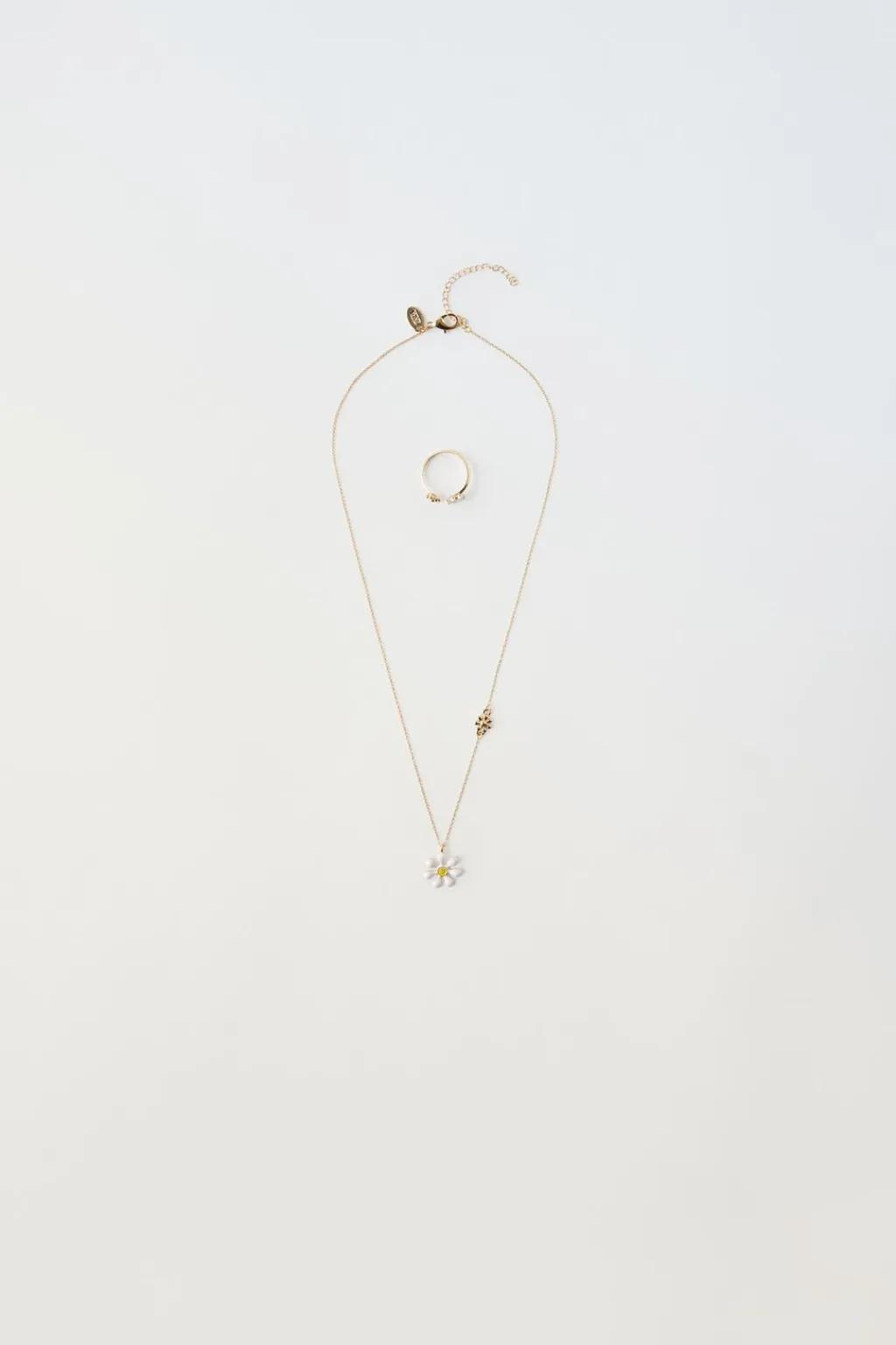 Pack de dos piezas. Collar con cierre ajustable en nuca y colgante de flor. Anillo con detalle en forma de flor.