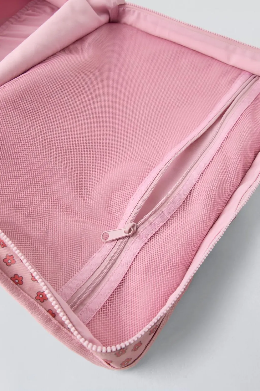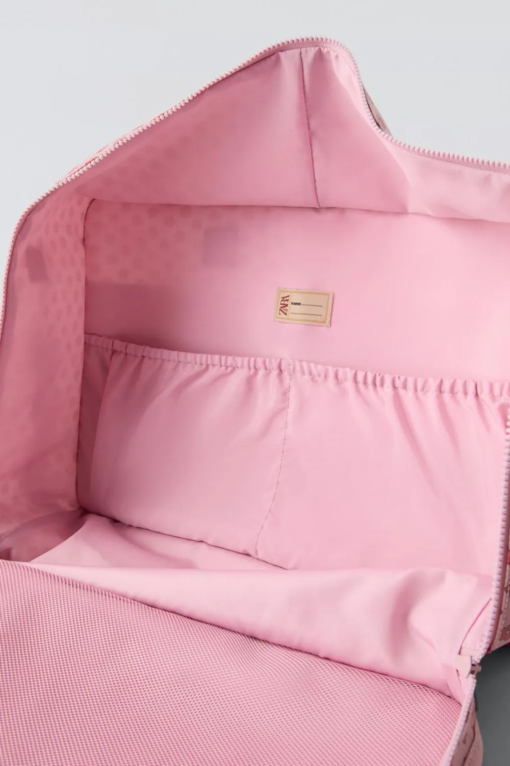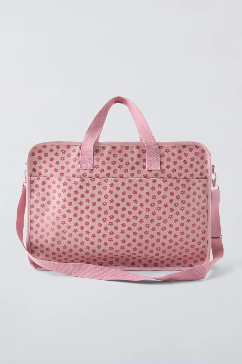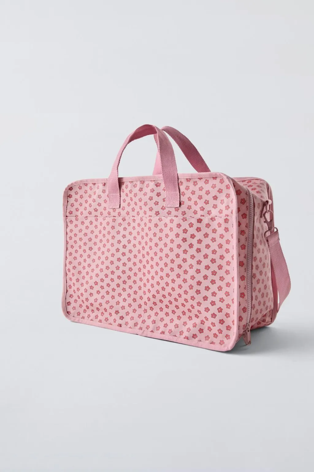 Bolsa de viaje con estampado flores. Cierre mediante cremallera. Cuenta con dos bolsillos frontales sin cierre y otro bolsillo trasero con cierre mediante tira adherente. En su interior tiene dos bolsillos sin cierre. Doble asa de mano y asa de hombro ajustable y extraíble.
