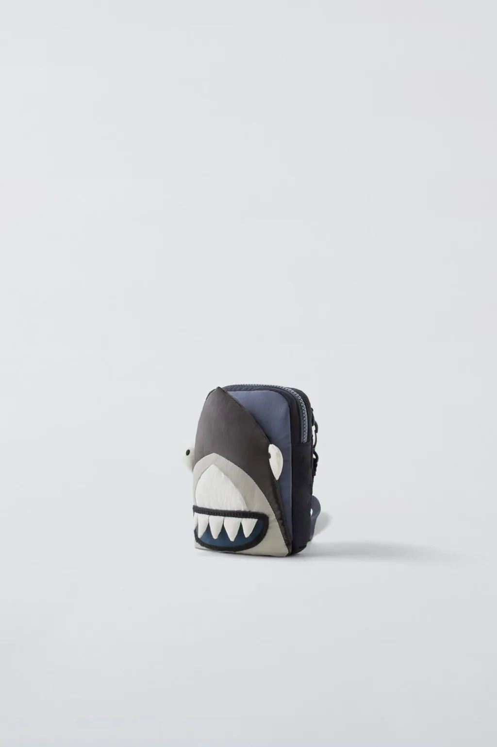 Bolso tipo bandolera en forma de tiburón. Compartimento principal con cierre mediante cremallera. Asa de hombro ajustable y extraíble.