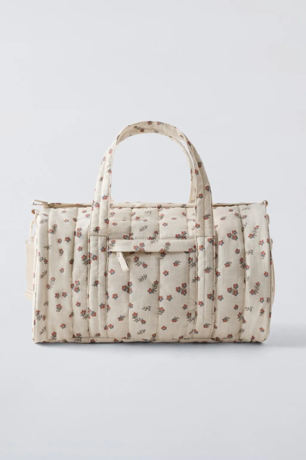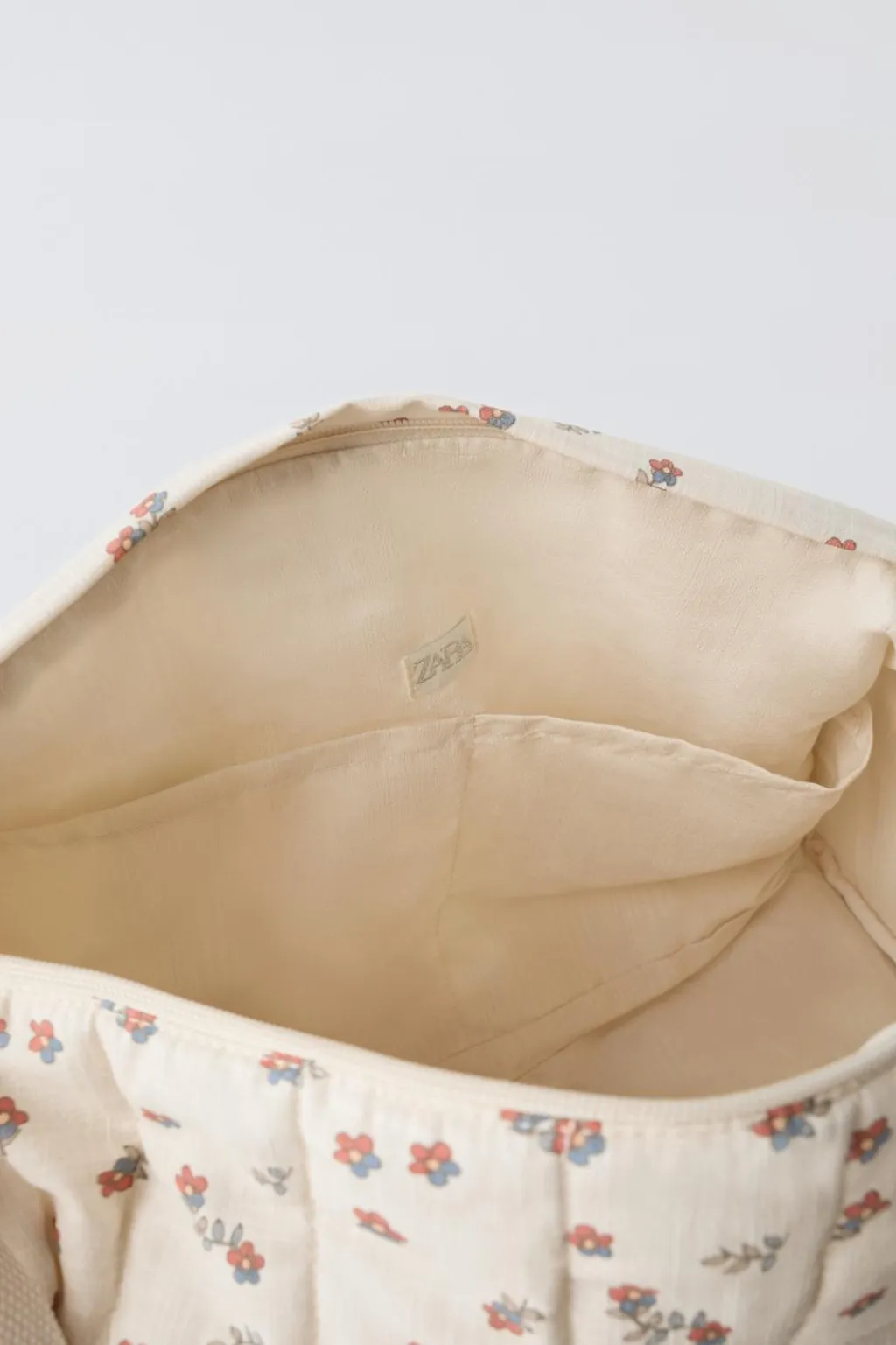 Bolsa de maternidad con estampado de flores. Compartimento principal con cierre mediante cremallera. En su interior cuenta con dos bolsillos sin cierre. En la parte frontal cuenta con un bolsillo con cierre mediante cremallera. Doble asa de mano y asa de hombro ajustable y extraíble.