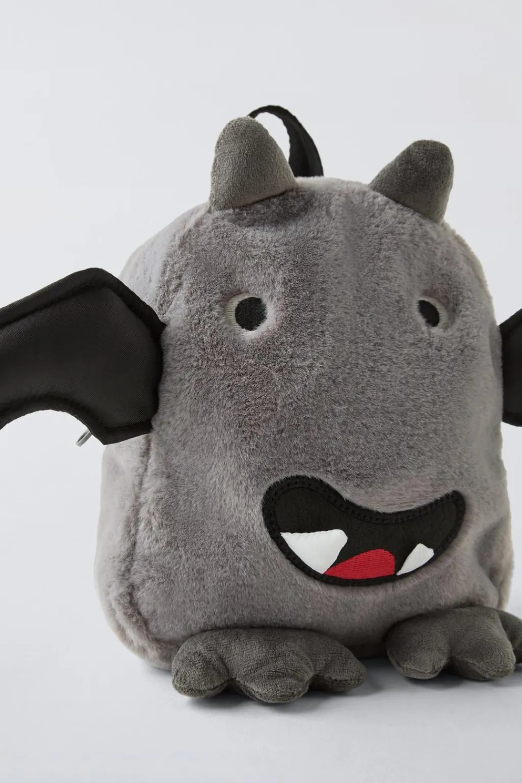 Mochila en forma de monstruito con pelo. Compartimento principal con cierre mediante cremallera. Asa de mano y doble asa de hombro ajustable.