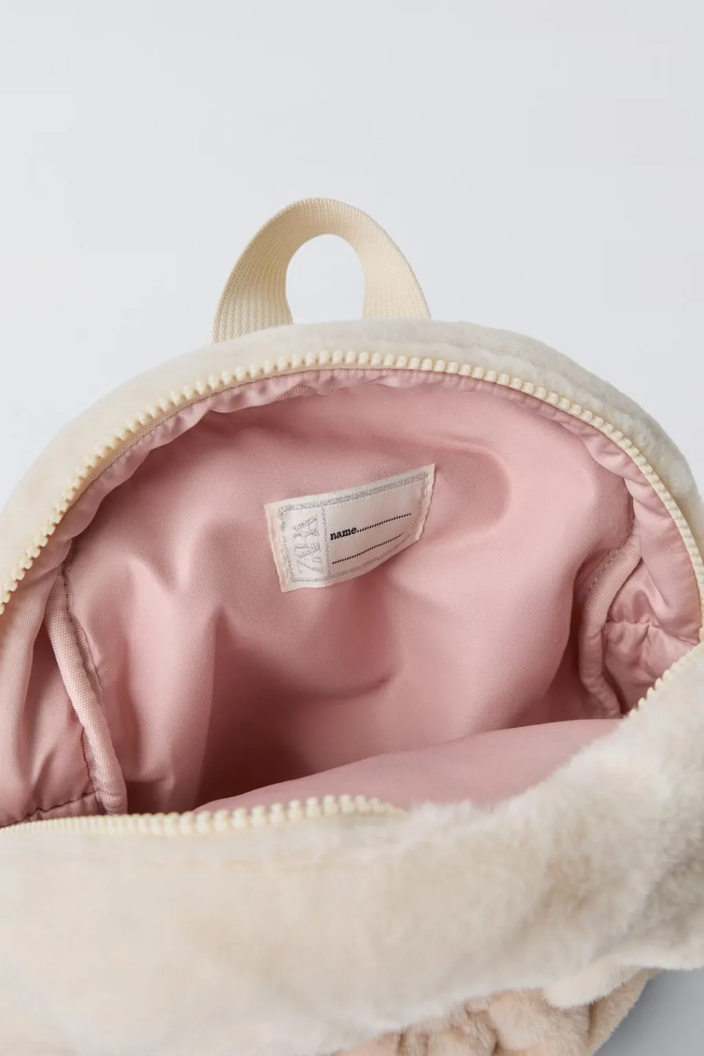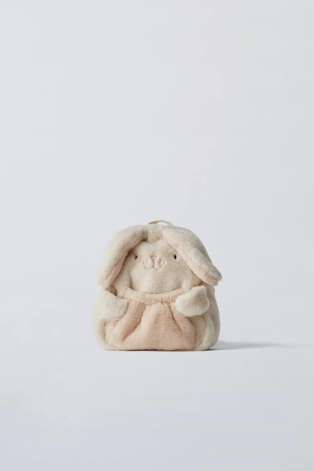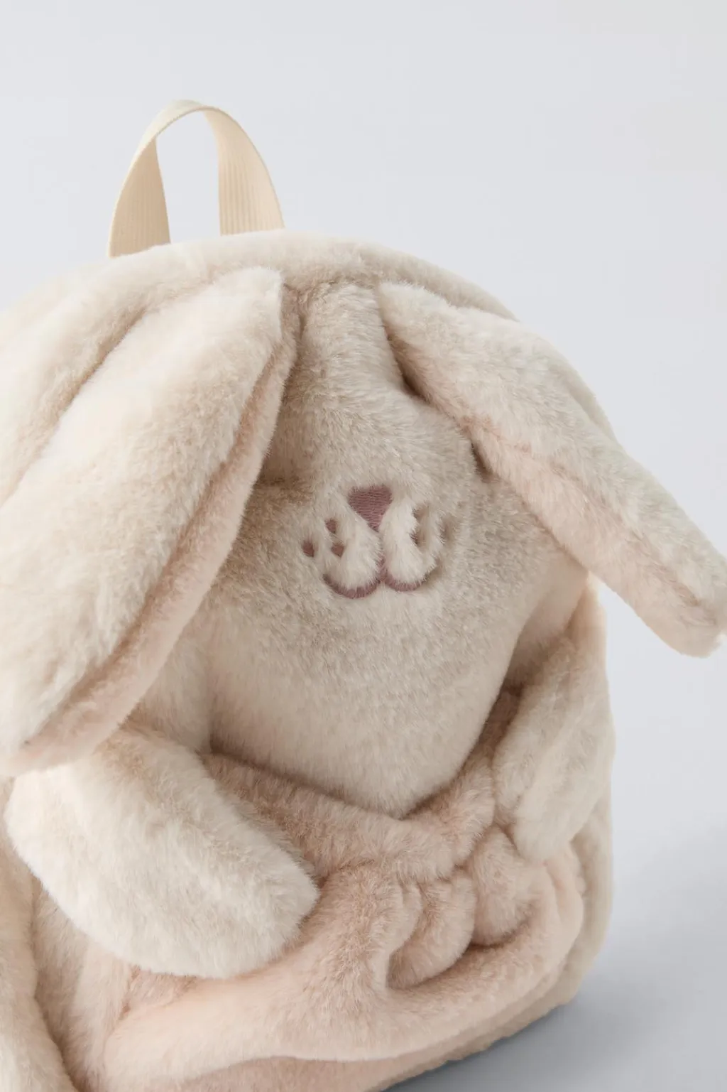 Mochila en forma de conejito con pelo. Compartimento principal con cierre mediante cremallera. Cuenta con un bolsillo frontal sin cierre. Asa de mano y doble asa de hombro ajustable.