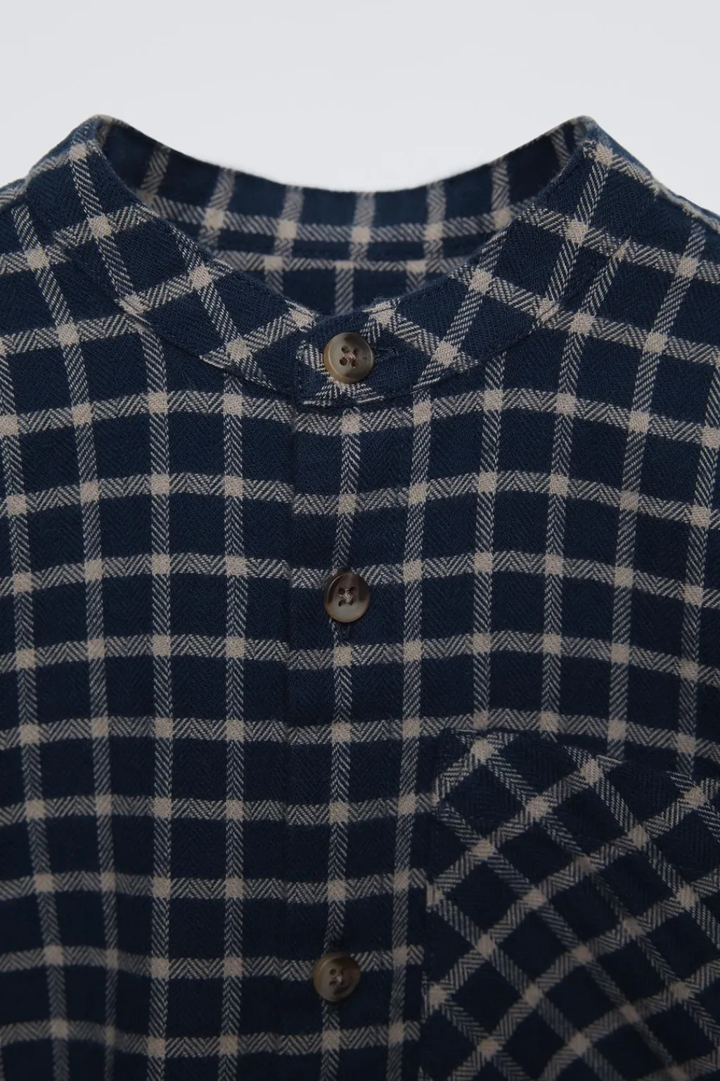Camisa con cuello mao y manga larga. Cierre botonadura frontal. Bolsillo de tipo plastrón en pechera.