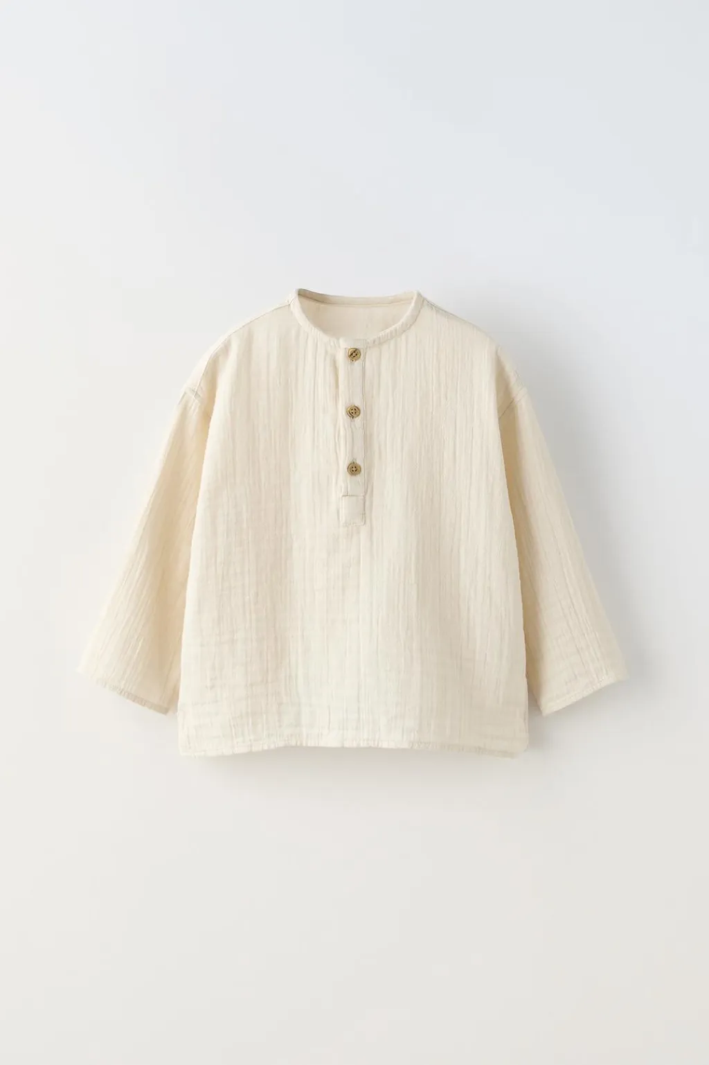 Camisa con cuello panadero y manga larga. Botonadura en pechera.