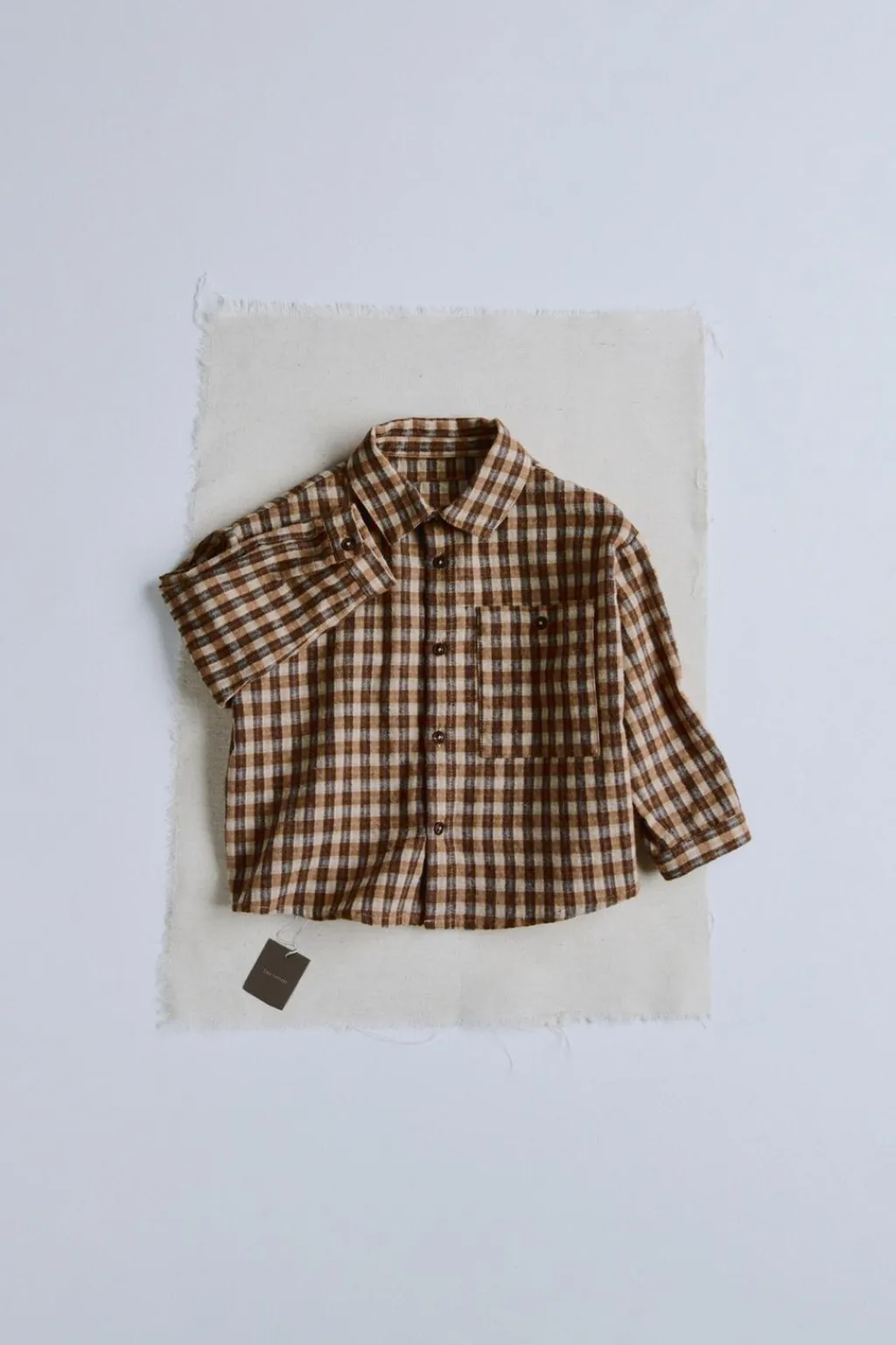 Camisa confeccionada en tejido con algodón y un patrón ancho. Los botones del cierre tienen acabado efecto madera. El detalle está en el bolsillo de la pechera con cierre de botón.