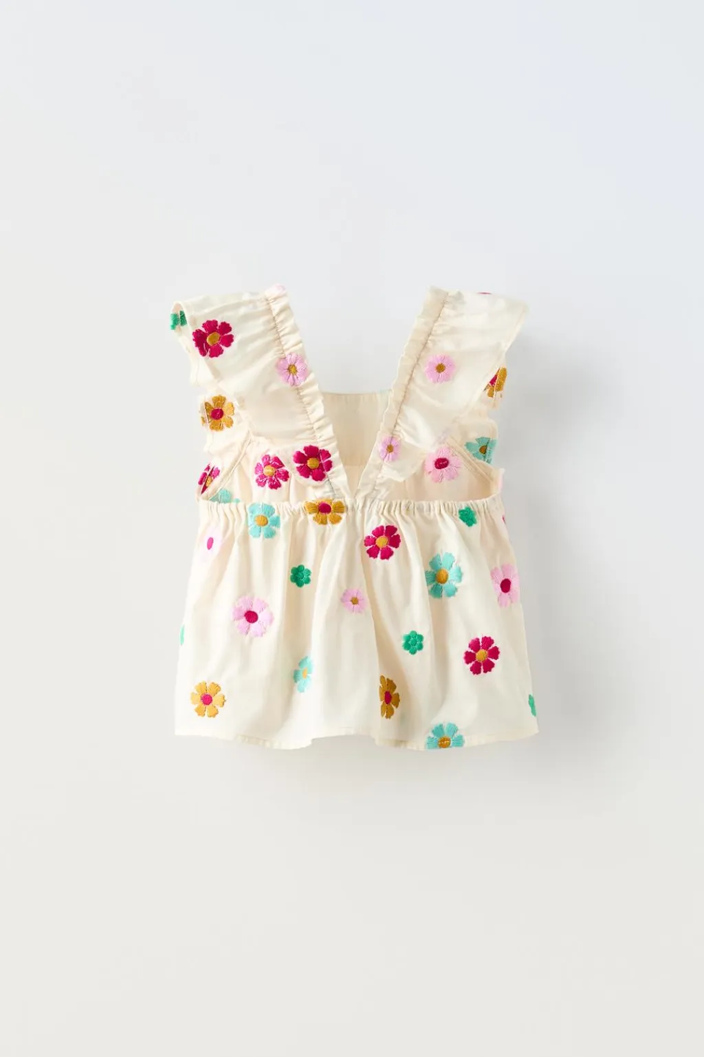 Camisa con cuello recto y tirantes con aplique volantes. Detalle goma en espalda. Motivo flores bordado all over.