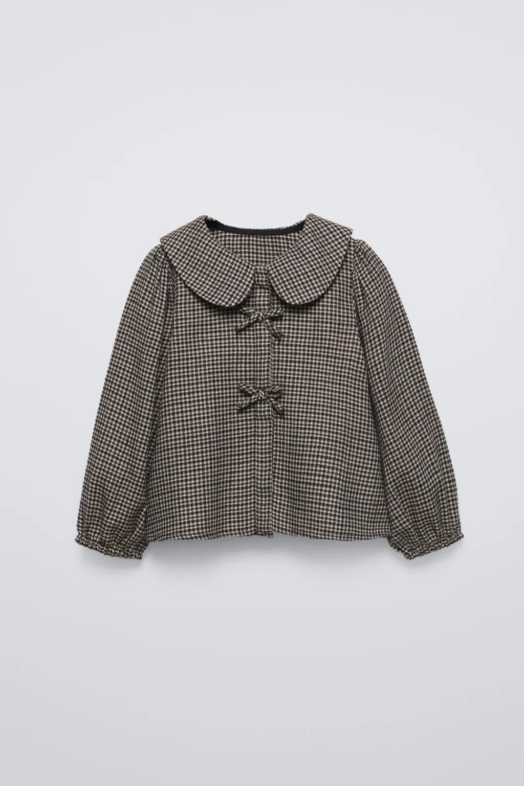 Camisa con cuello bobo y manga larga acabada en goma. Cierre botonadura frontal oculta con aplique lazos.