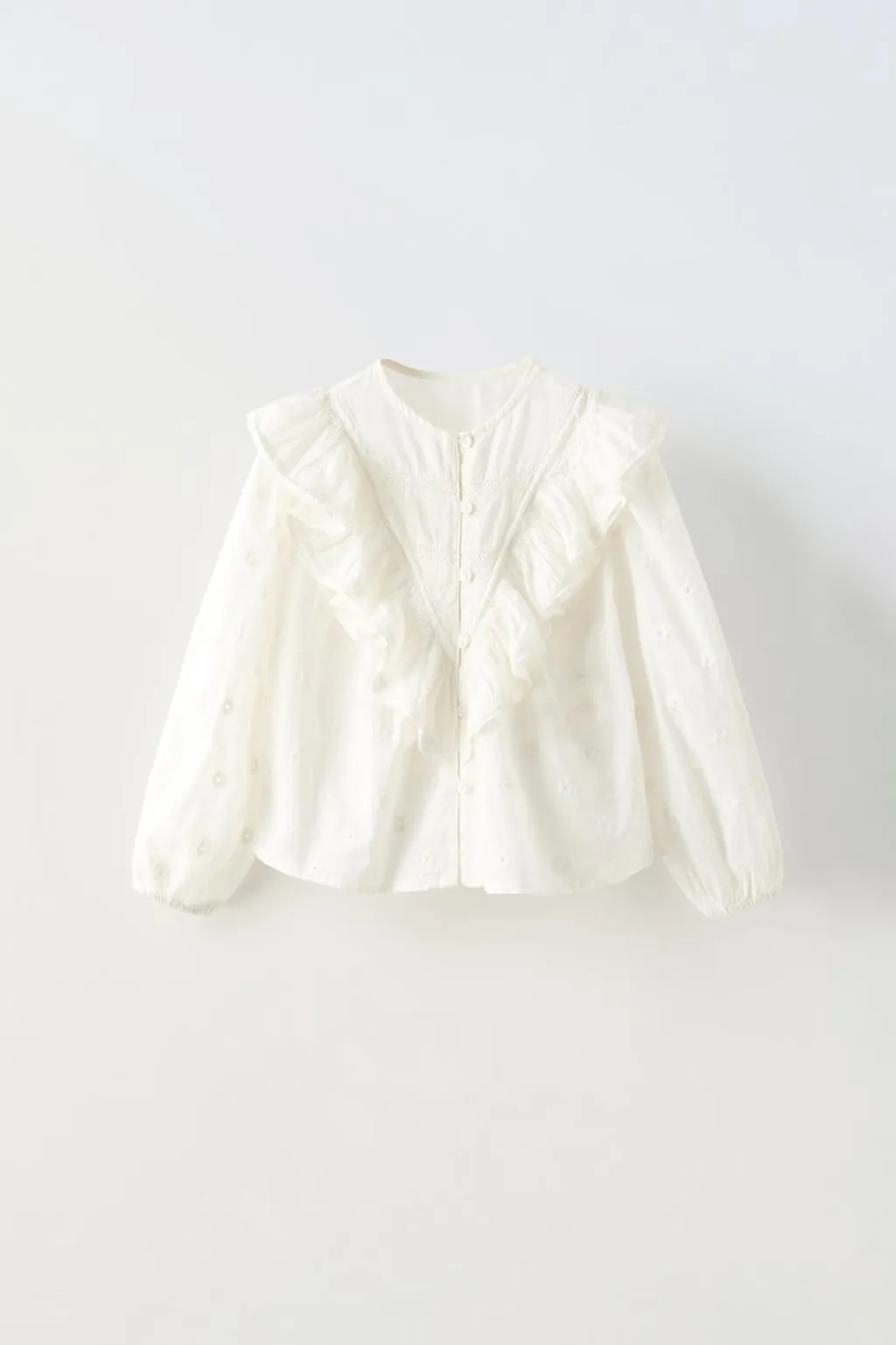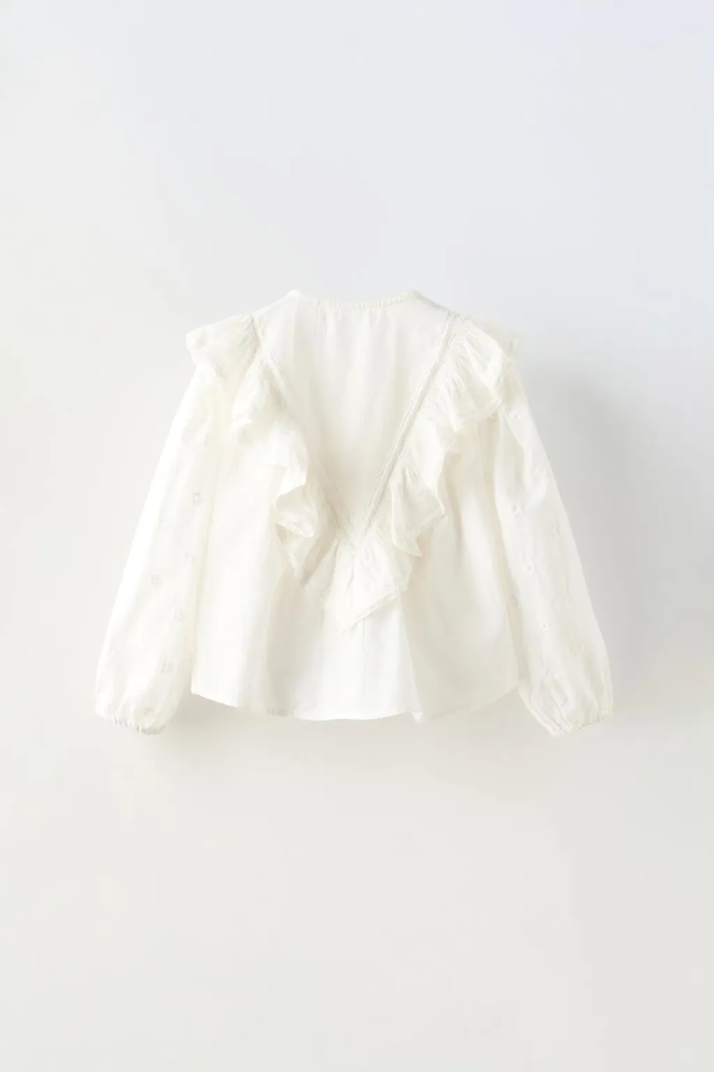 Camisa con cuello redondo y manga larga. Cierre con botonadura frontal. Aplique volante en delantero y espalda.