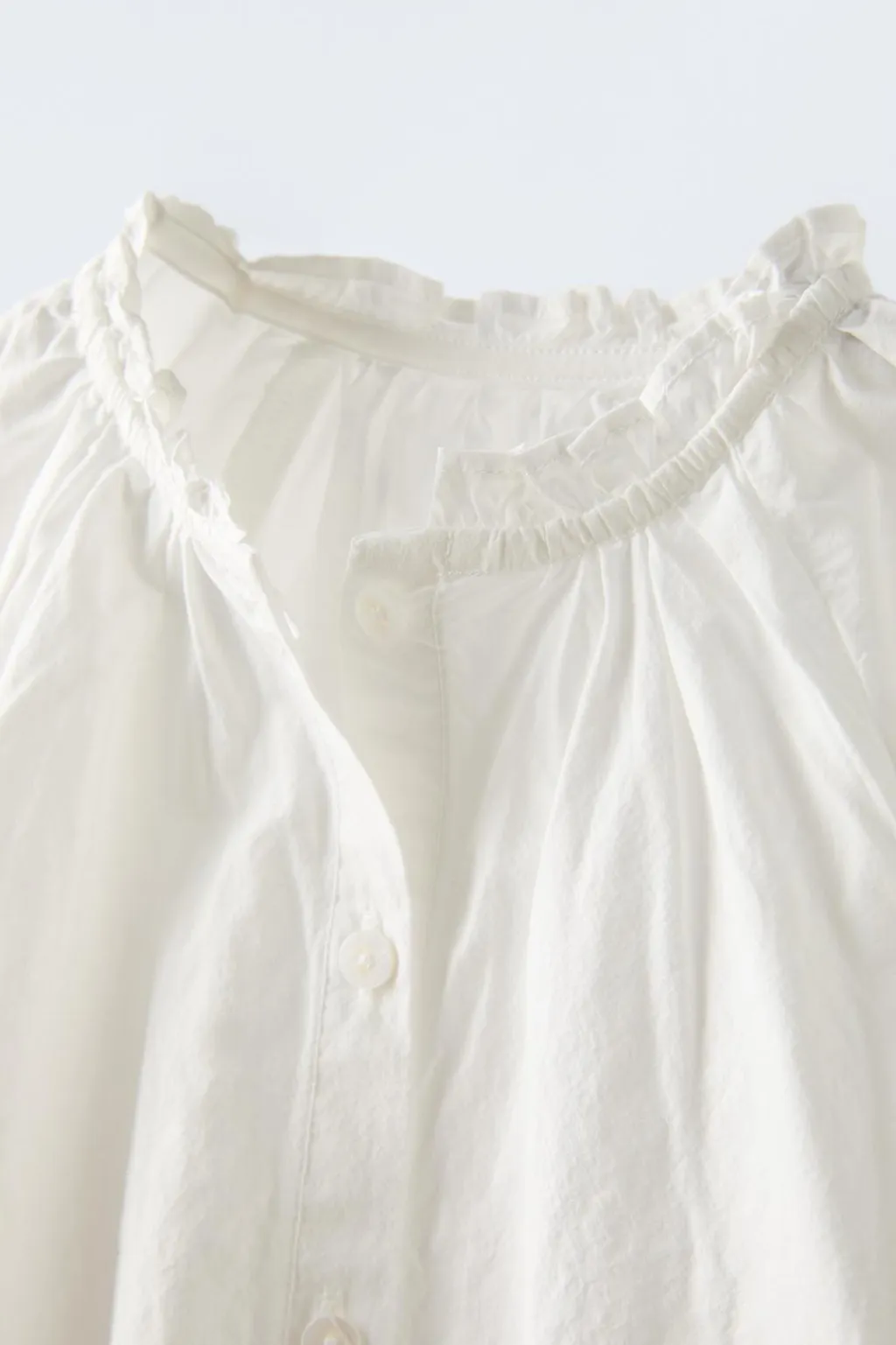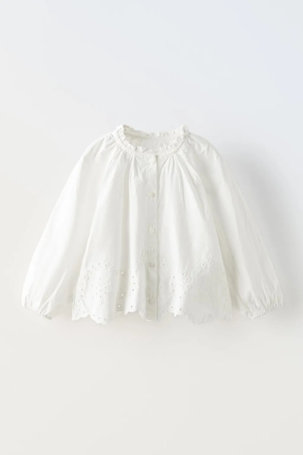Camisa con cuello redondo y manga larga acabada en goma. Cierre botonadura frontal. Bajo acabado en ondas con bordado.
