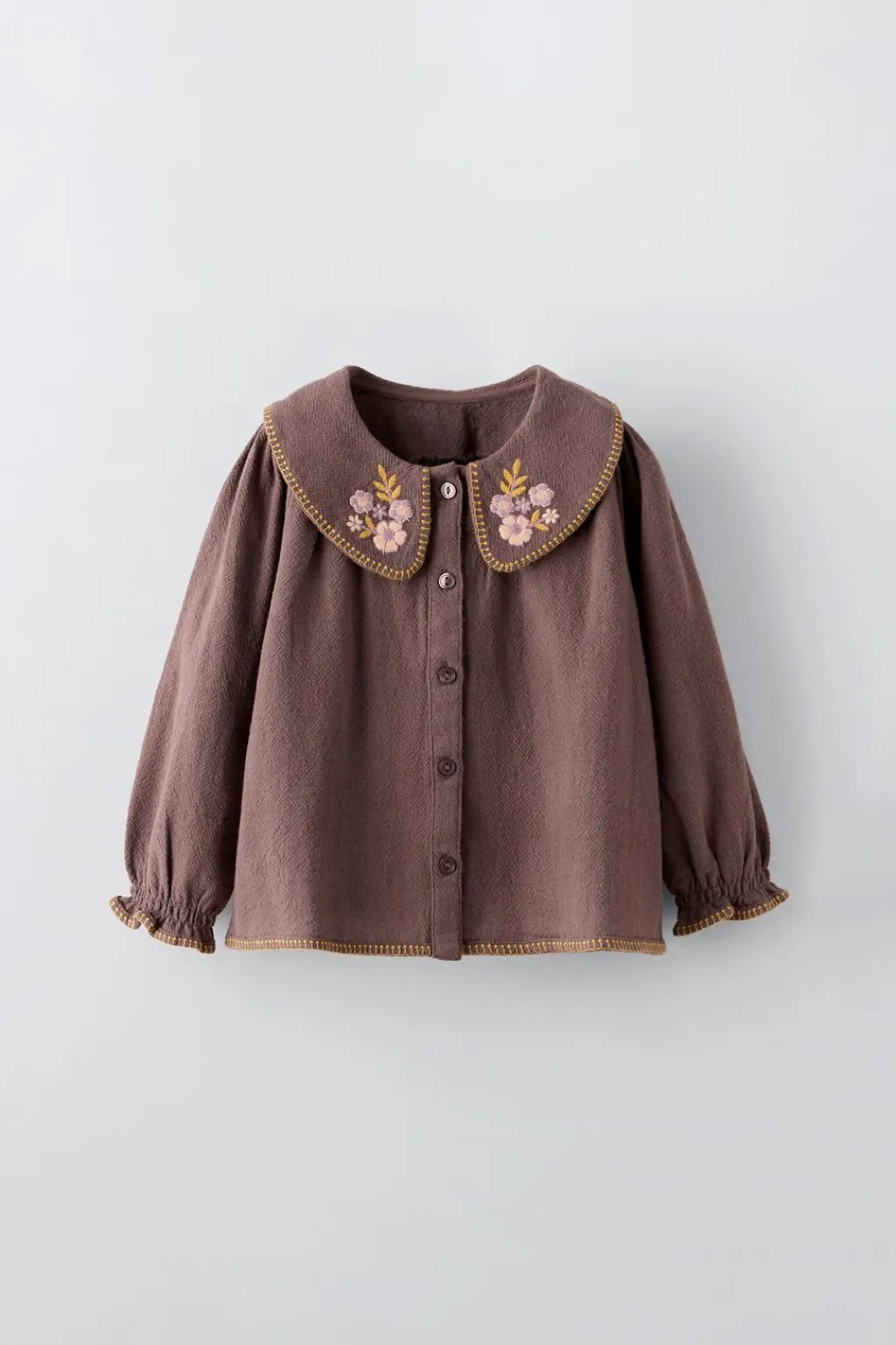 Camisa con cuello bobo y manga larga acabada en goma. Cierre con botonadura frontal. Detalle bordados en cuello y acabados.