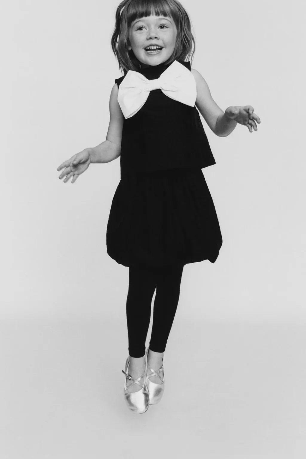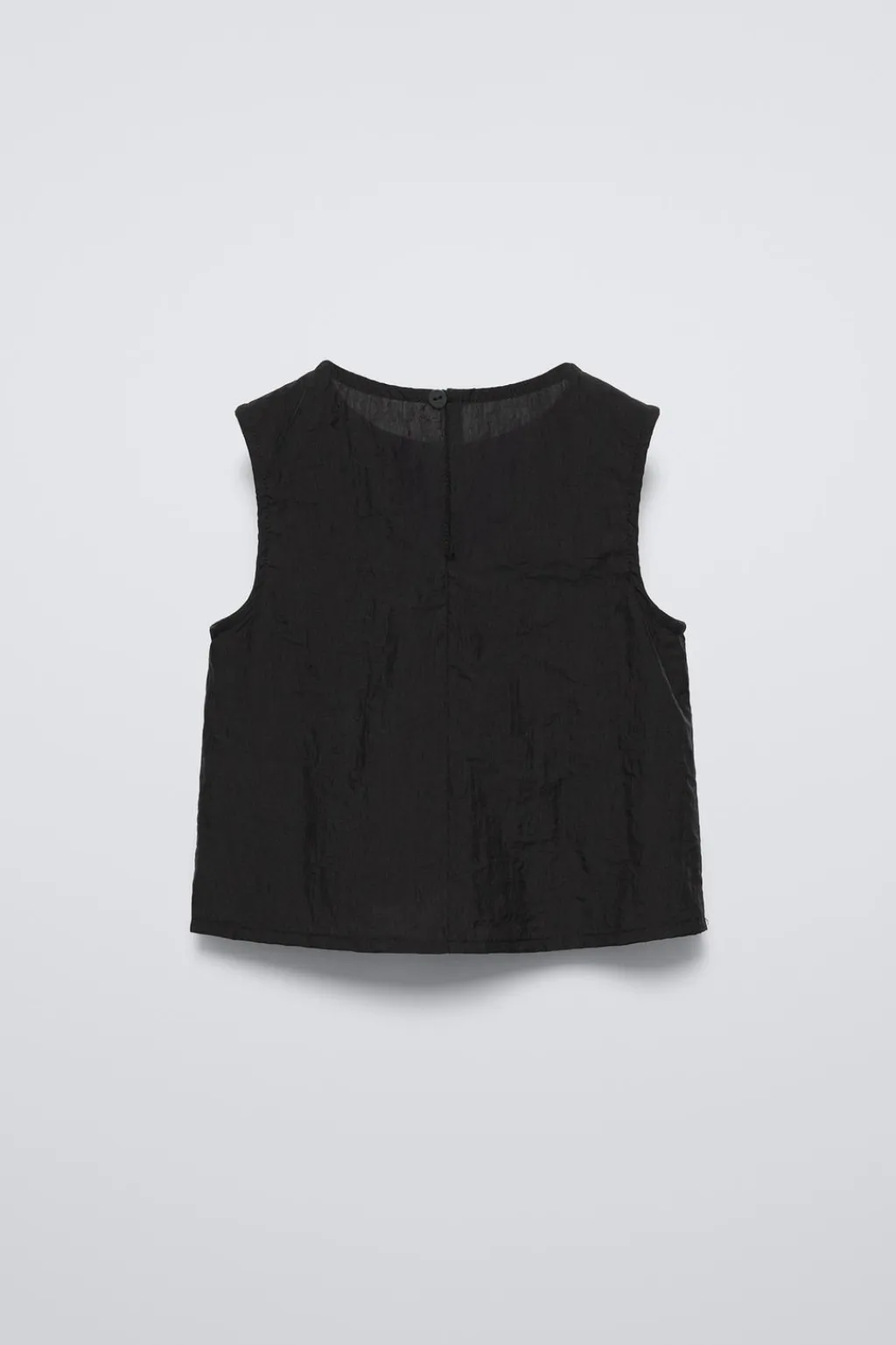 Camisa con cuello redondo y manga sisa. Cierre botón en espalda. Aplique lazo en pechera color a contraste. Tejido efecto arrugado.
