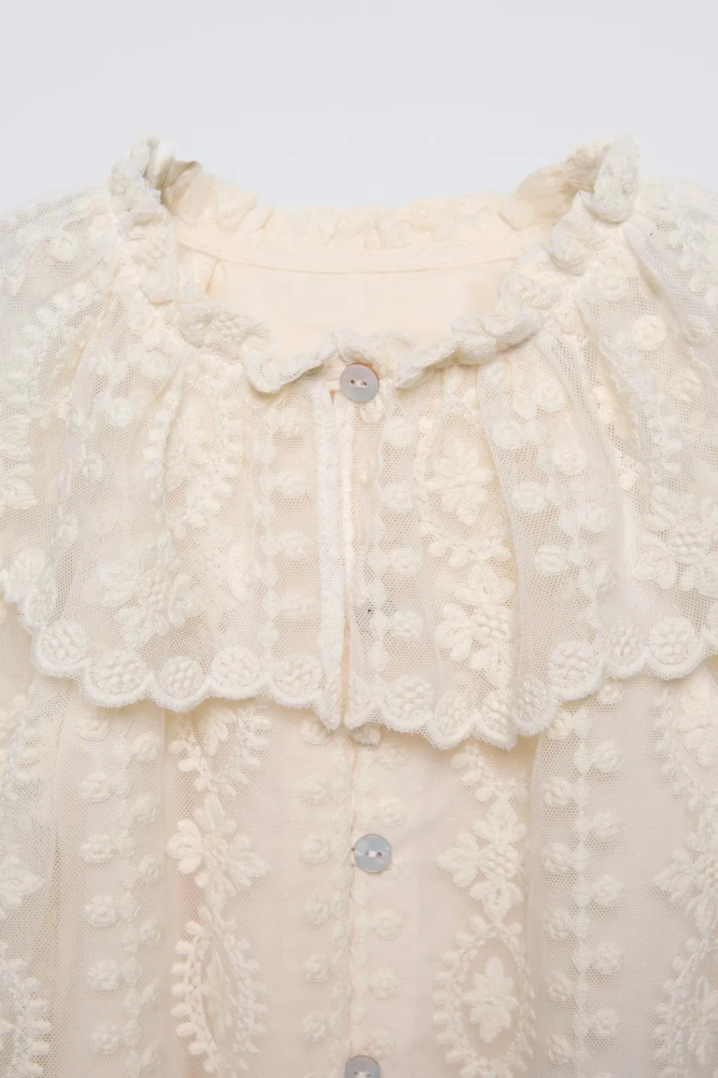 Camisa con cuello redondo y manga larga acabada en goma. Cierre botonadura frontal. Aplique volante en el cuello. Detalle bordados. Forro interior combinado a tono.
