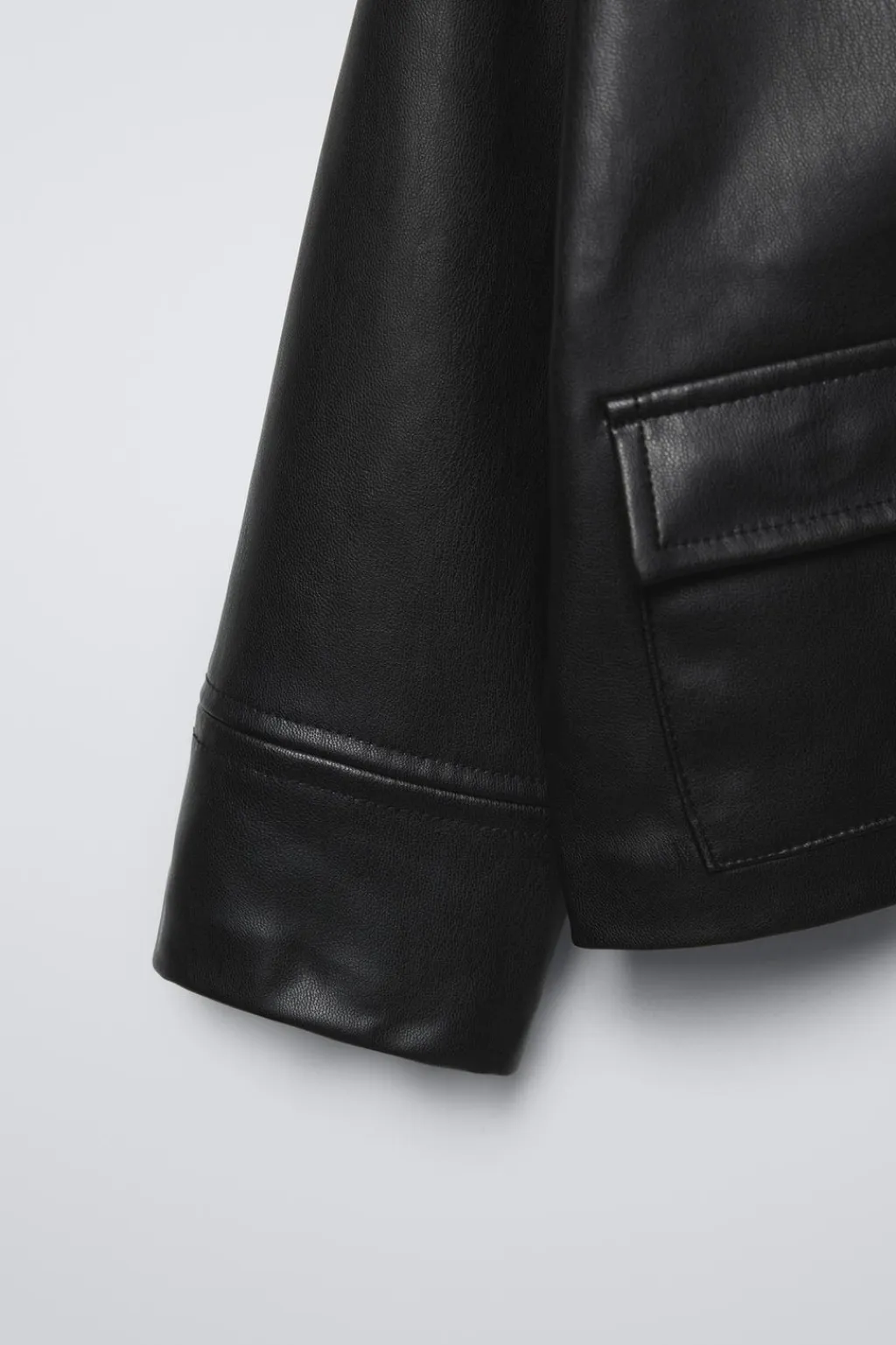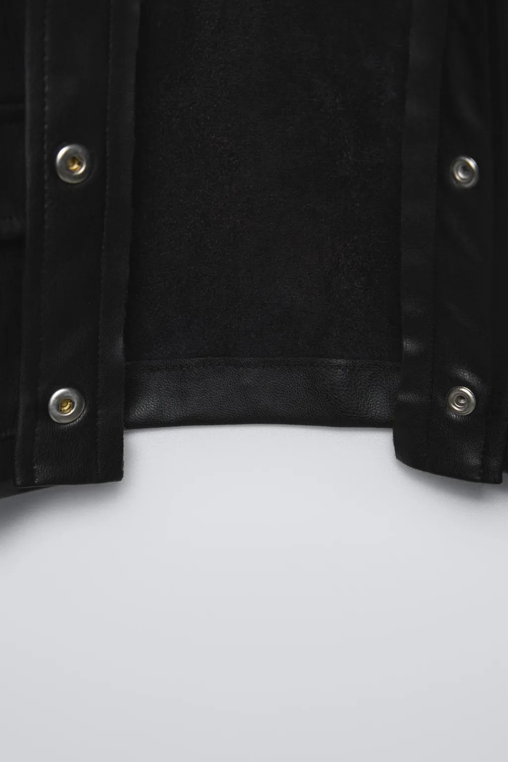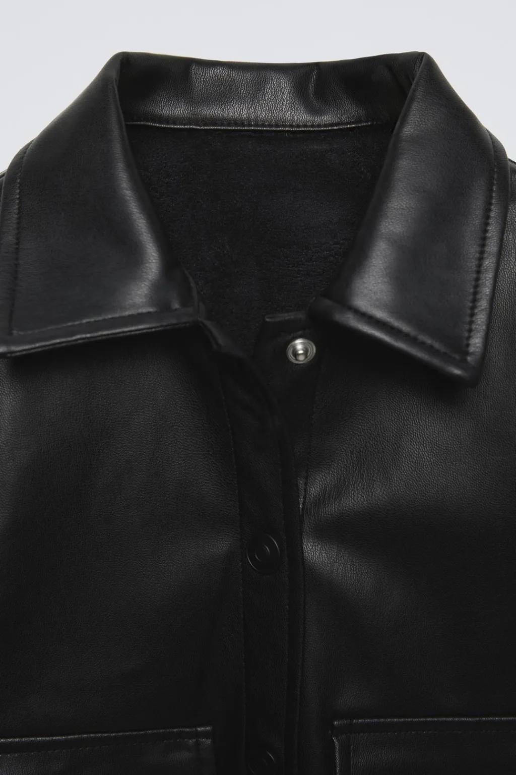 Sobrecamisa efecto piel con cuello camiseto y manga larga. Cierre con botonadura tipo presión frontal y bolsillos tipo plastrón con solapas en delantero.