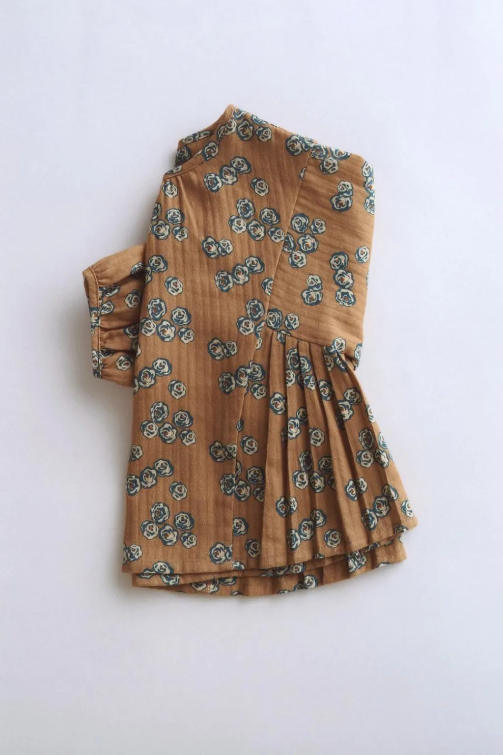 Camisa confeccionada en un tejido de algodón con estampado de flores. Tiene el cuello redondo con pequeños frunces. El detalle está en los pliegues laterales. Tiene cierre con botones en la espalda.