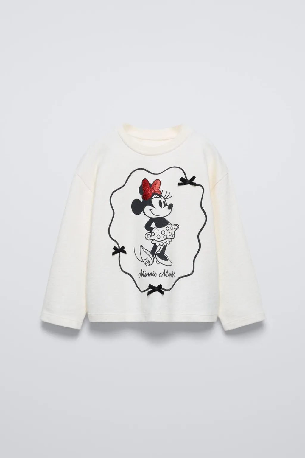 Camiseta con cuello redondo y manga larga. Estampado MINNIE MOUSE © DISNEY con detalle brillo y aplique lacitos.