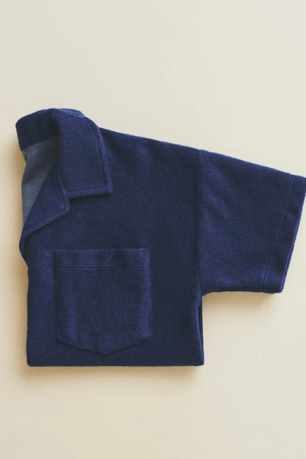 Polo con fit amplio confeccionado en tejido toalla con algodón. Detalle de cuello abierto y bolsillo en la pechera.