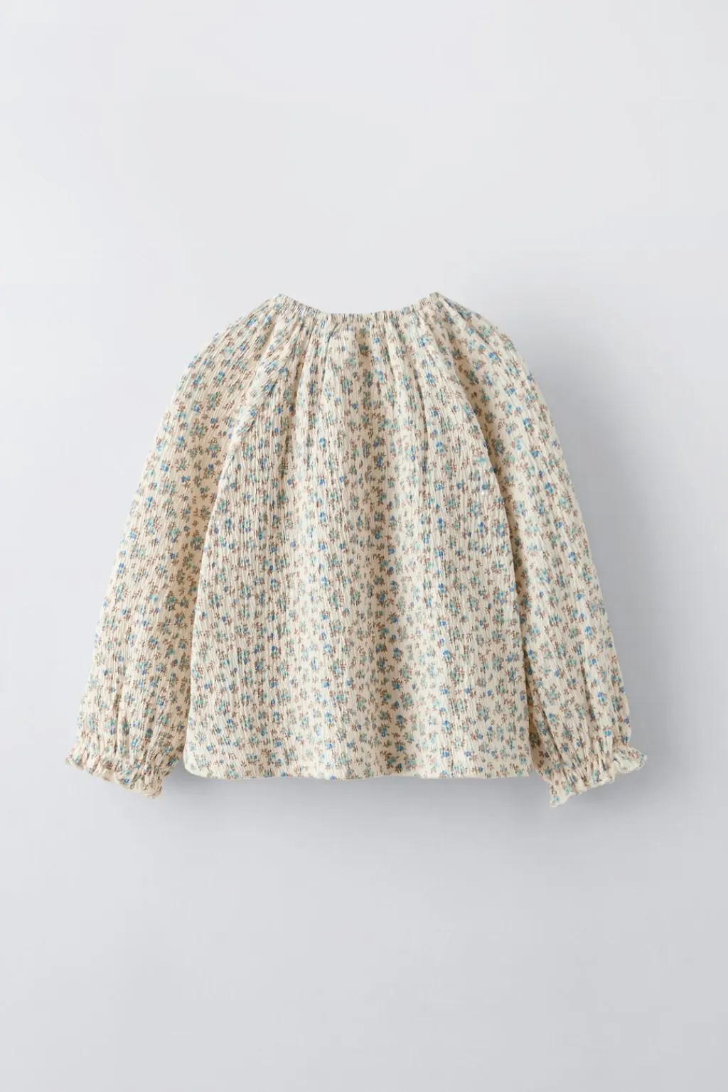 Blusa con cuello redondo y manga larga acabado en goma. Estampado flores.