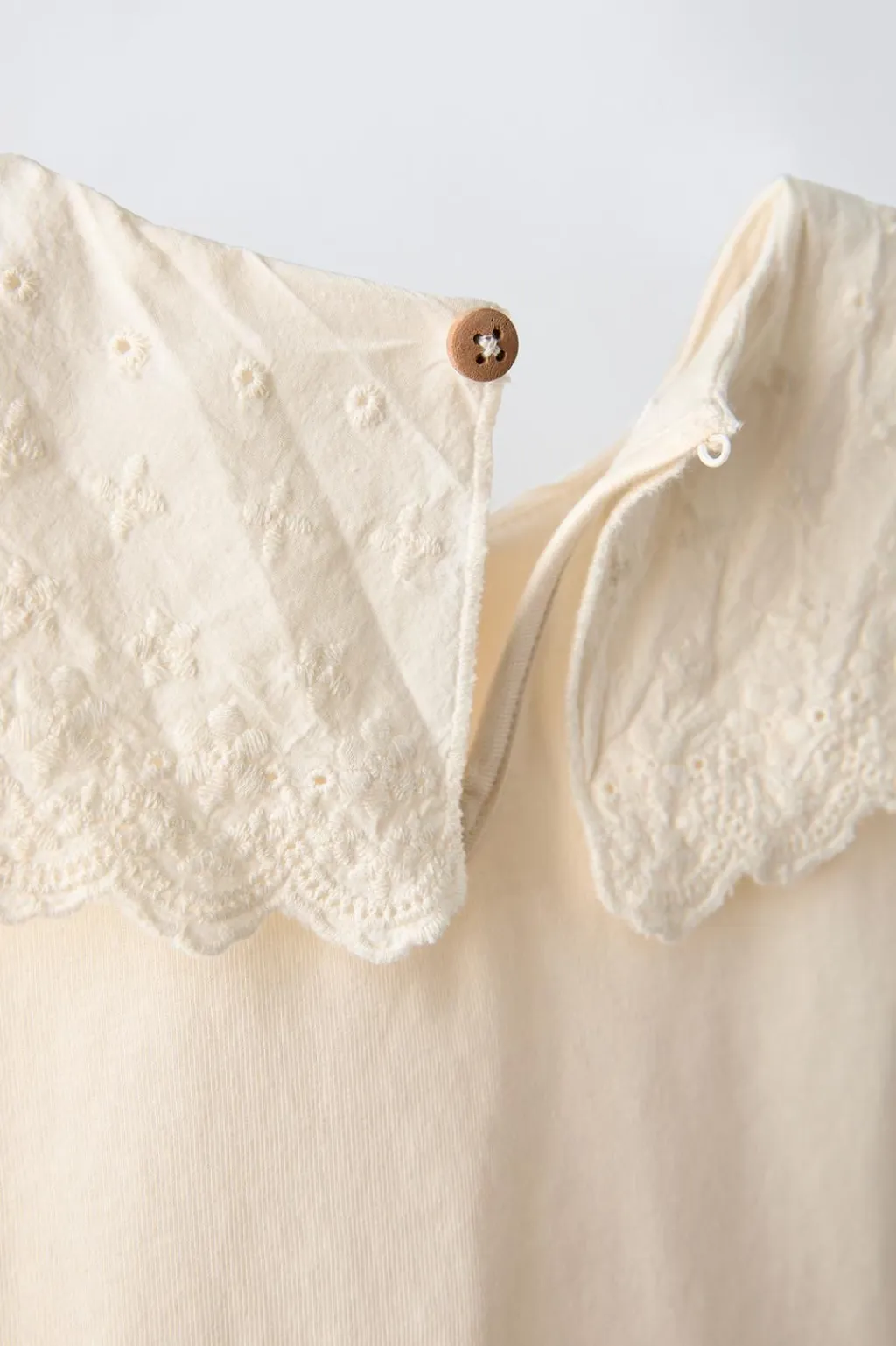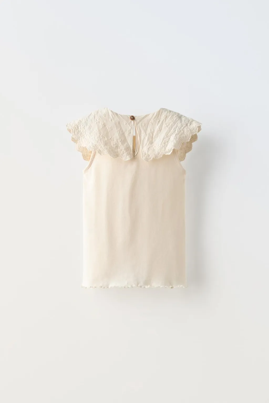 Camiseta con cuello lazo bordado y manga sisa. Cierre tipo lágrima con botón en espalda.