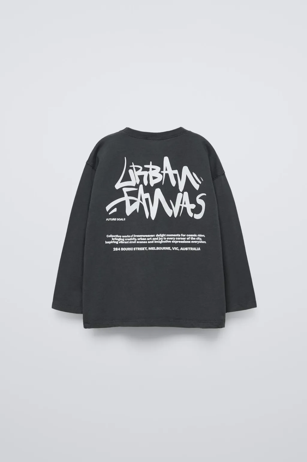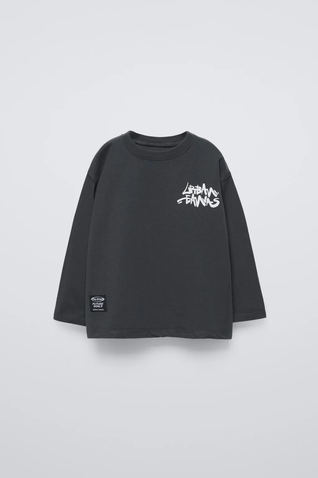 Camiseta con cuello redondo y manga larga. Estampado graffiti en delantero y espalda. Aplique etiqueta en bajo.