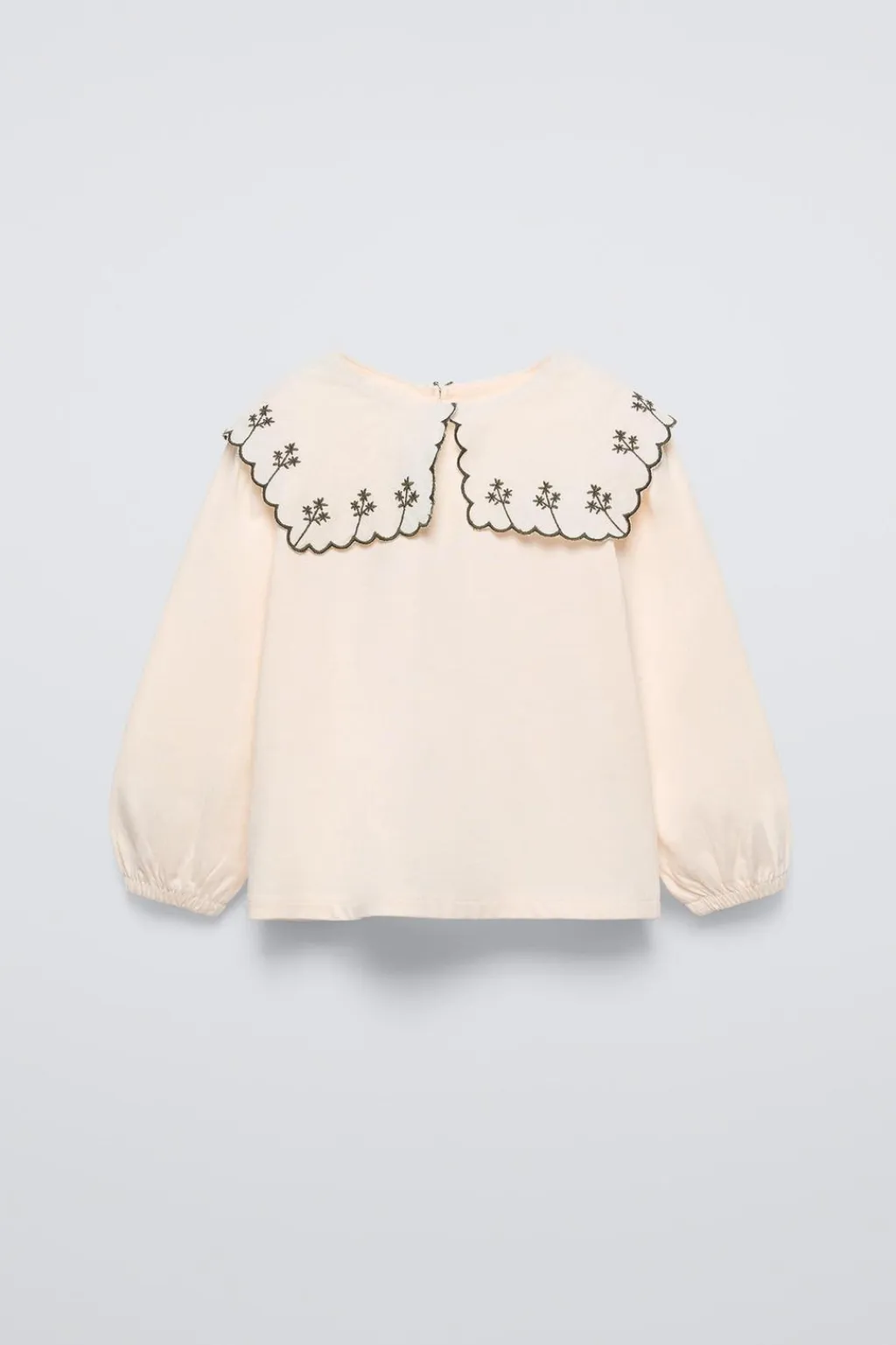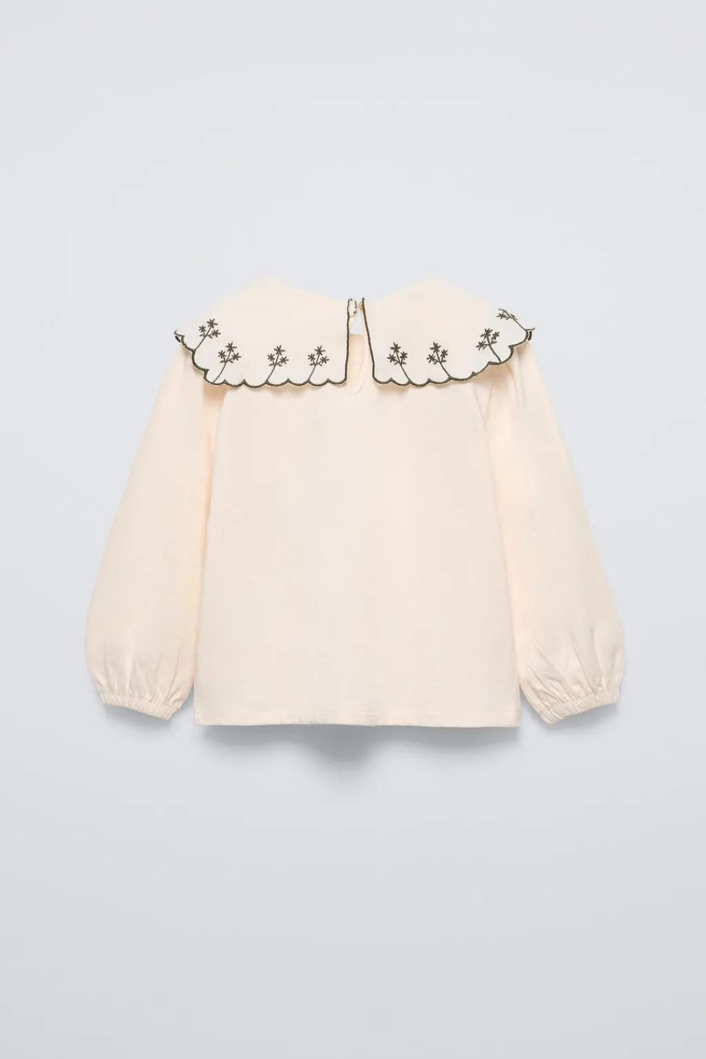 Camiseta con cuello bobo bordado y manga larga acabada en goma. Cierre tipo lágrima con botón en espalda.