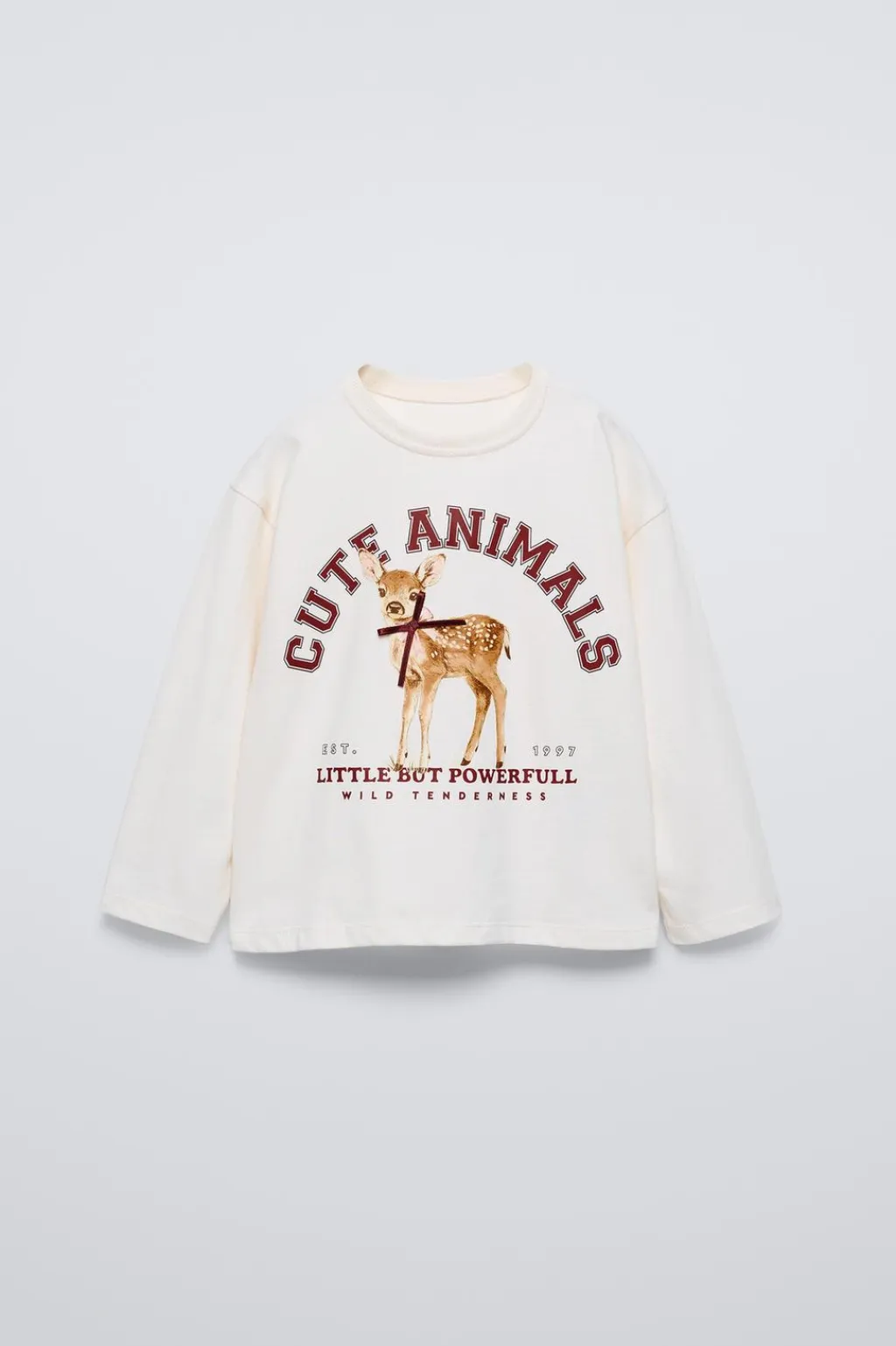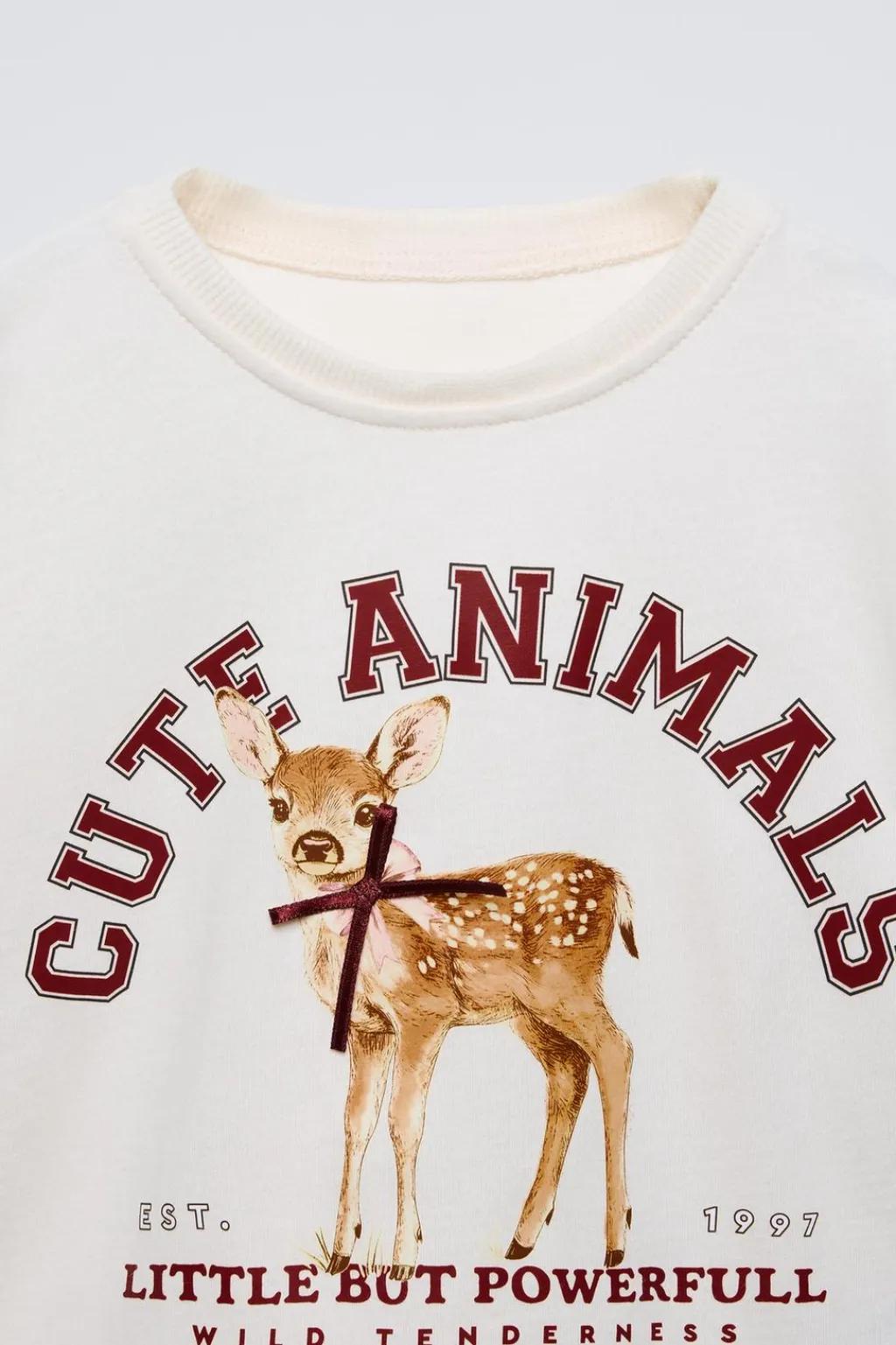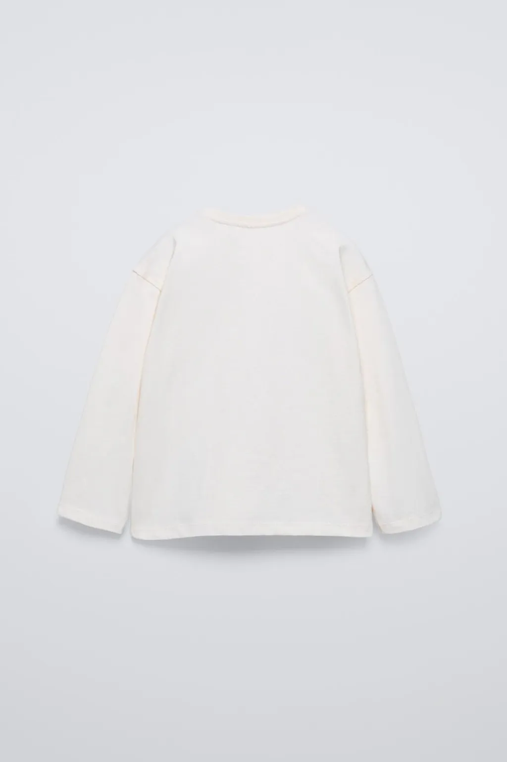 Camiseta con cuello redondo y manga larga. Estampado en delantero con aplique lazo frontal.
