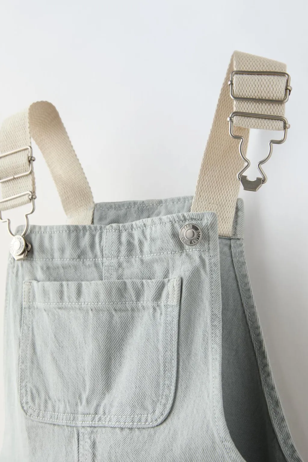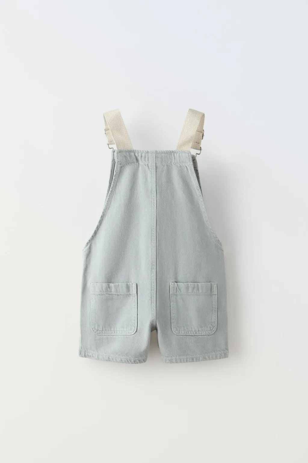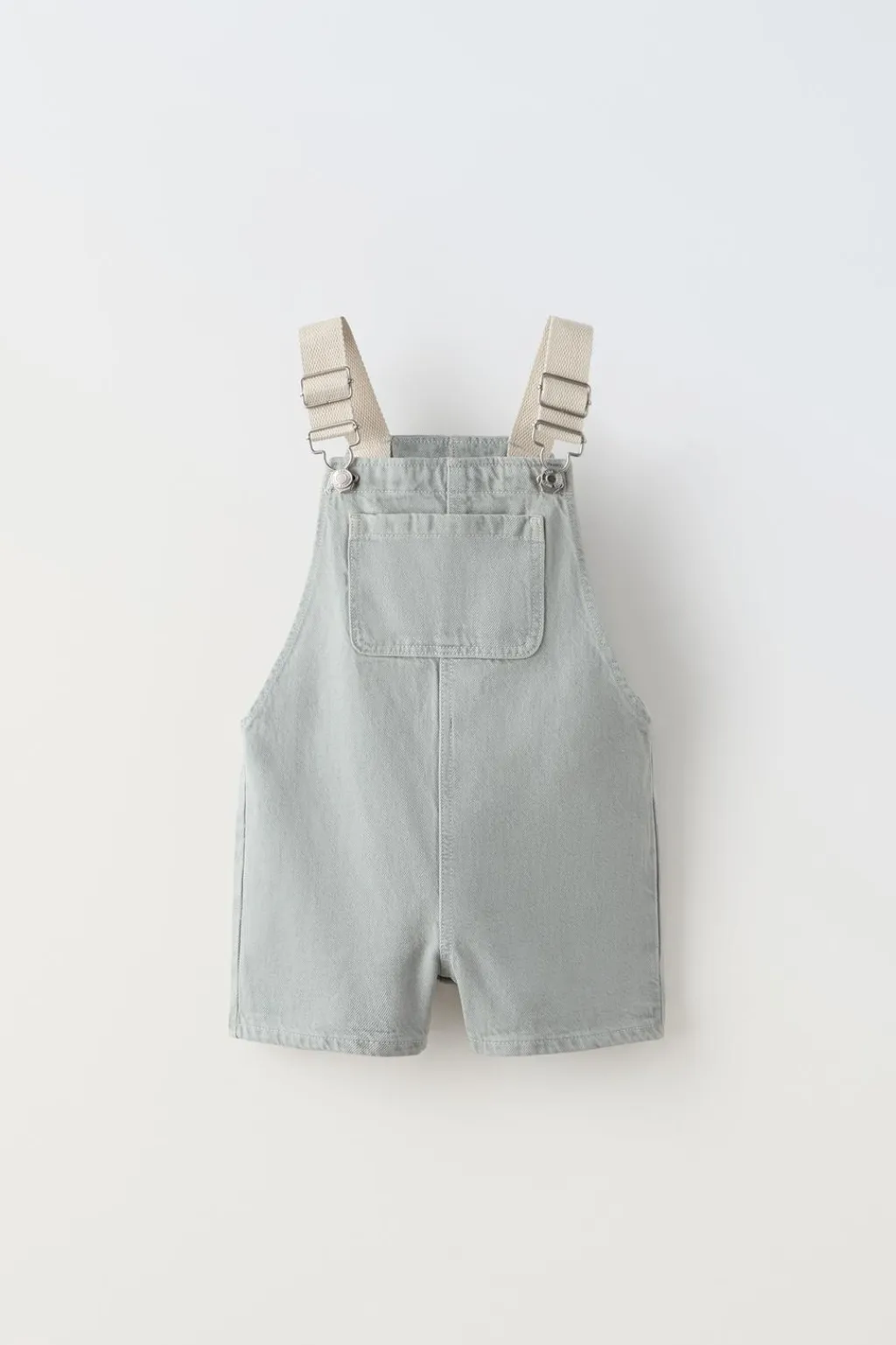 Peto con cuello recto y tirantes ajustables con jardineras. Bolsillo tipo plastrón en pechera y espalda.