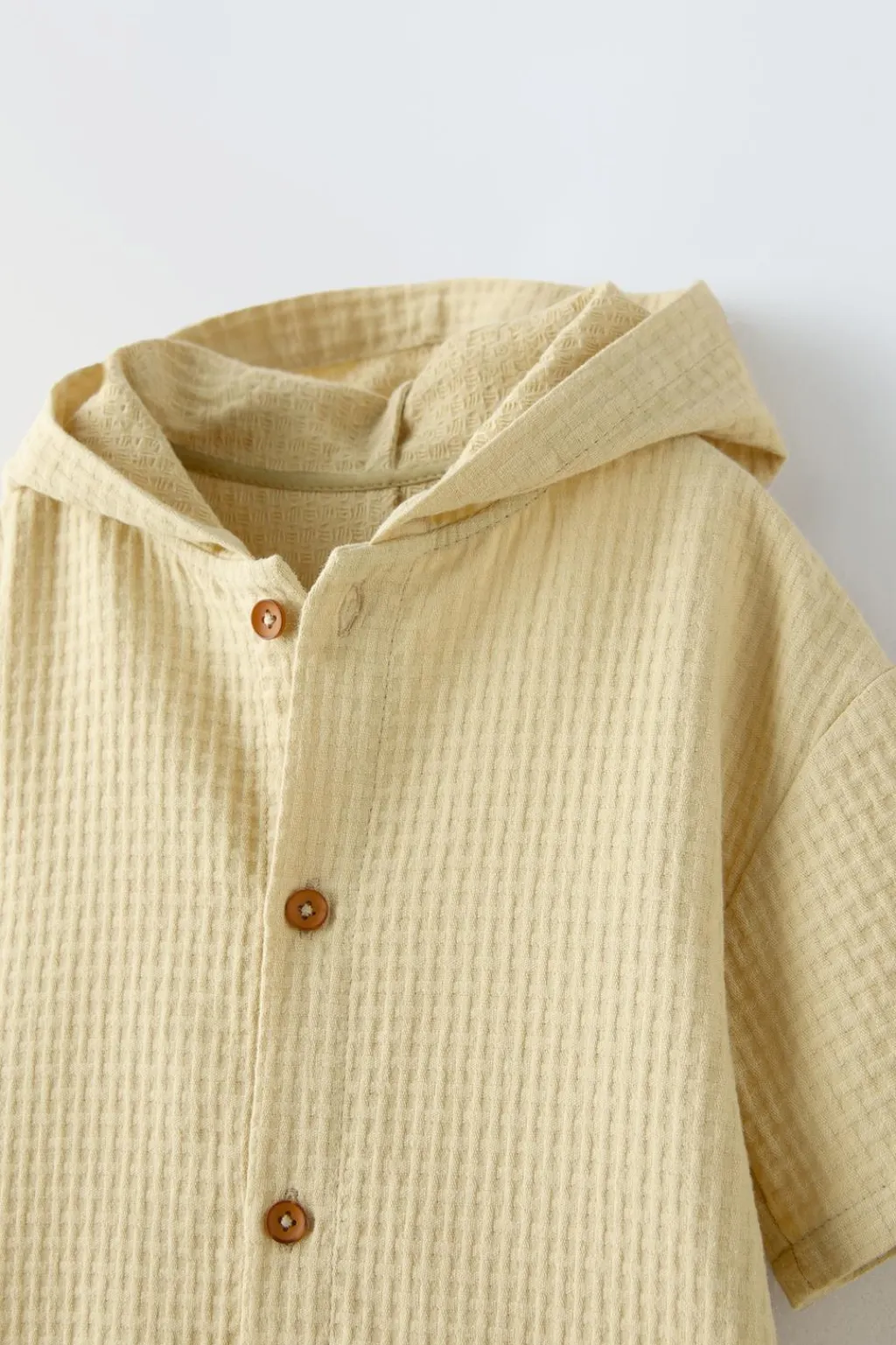 Peto con capucha y manga corta. Cierre con botonadura frontal. Bolsillos tipo plastrón en delantero.