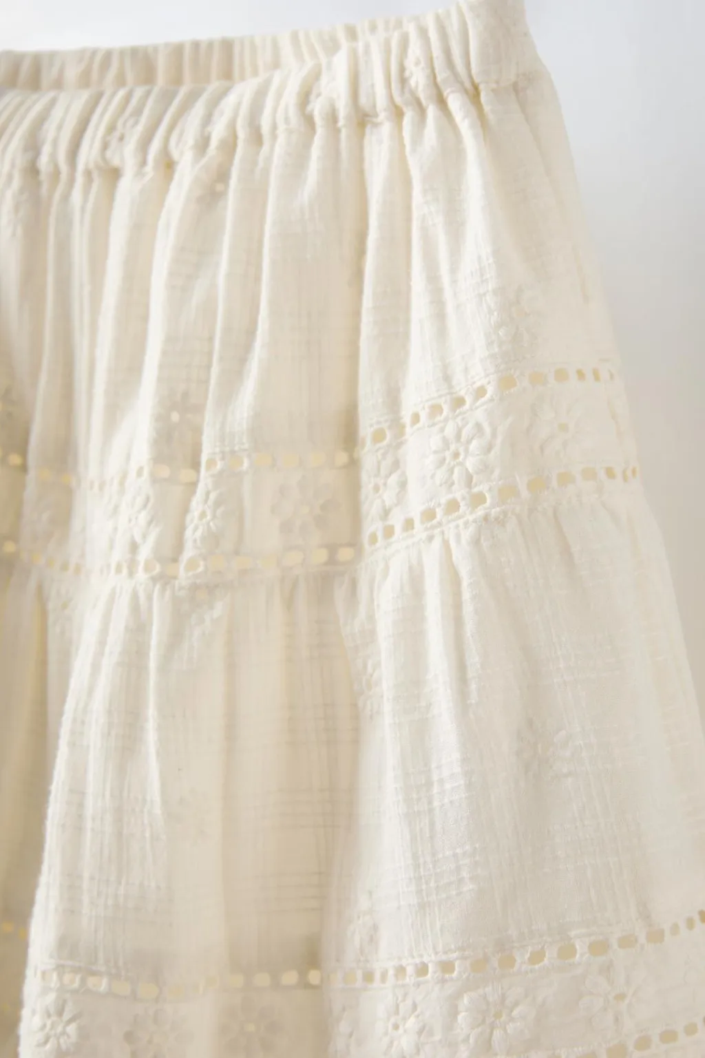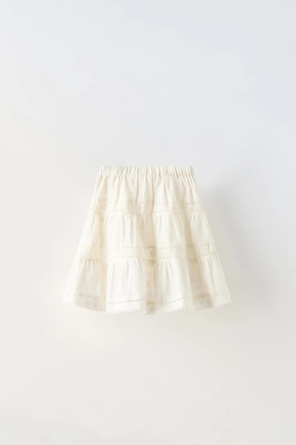 Falda con cinturilla elástica. Detalle perforados y bordados.