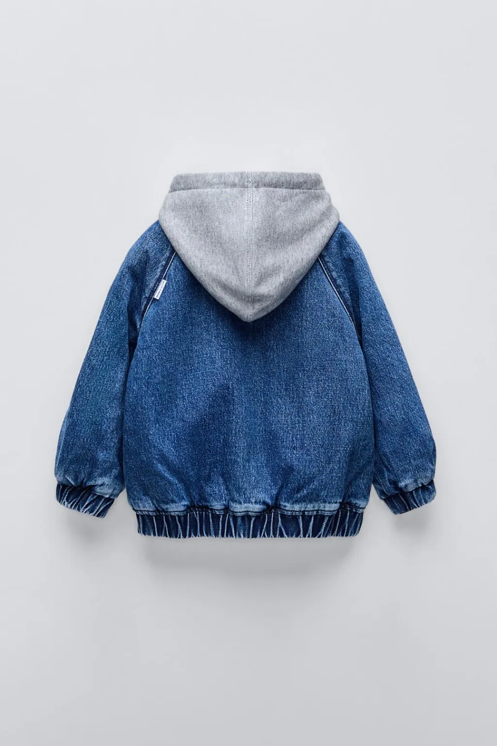 Chaqueta denim con cuello redondo y manga larga. Cierre con cremallera y bolsillos en delantero. Capucha combinada. Acabados en goma y aplique etiqueta en espalda.