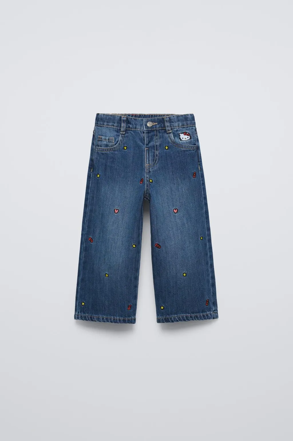 Jeans con cinturilla interior ajustable y cierre botón frontal. Bolsillos delanteros y de tipo plastrón en espalda. Detalle bordados HELLO KITTY ©.