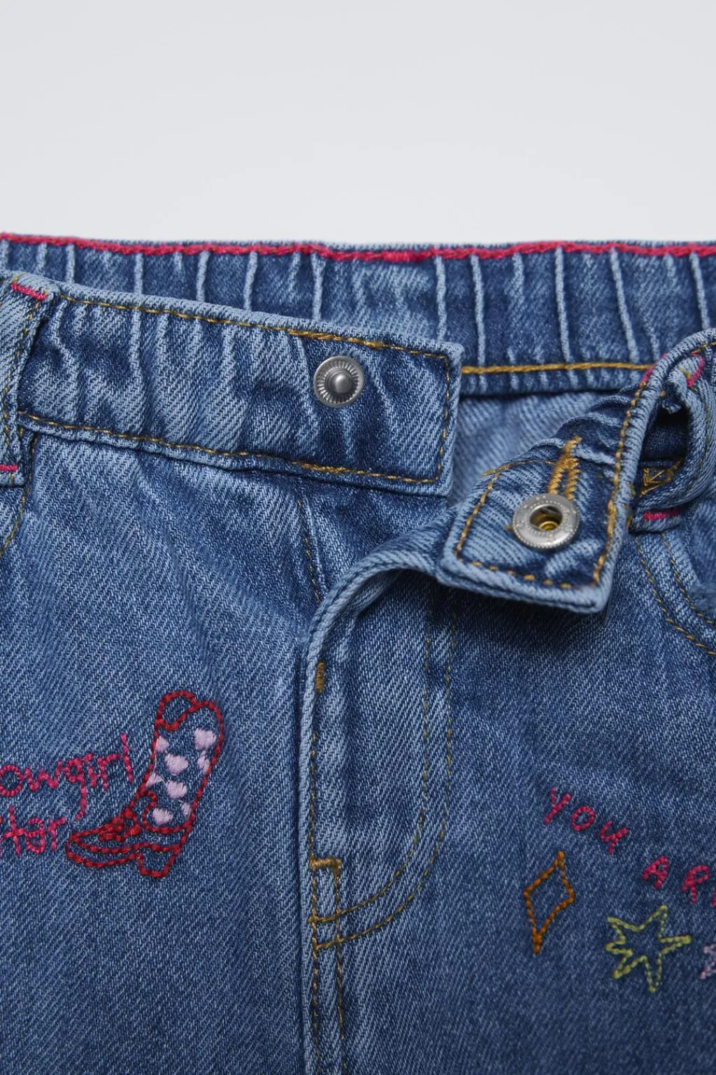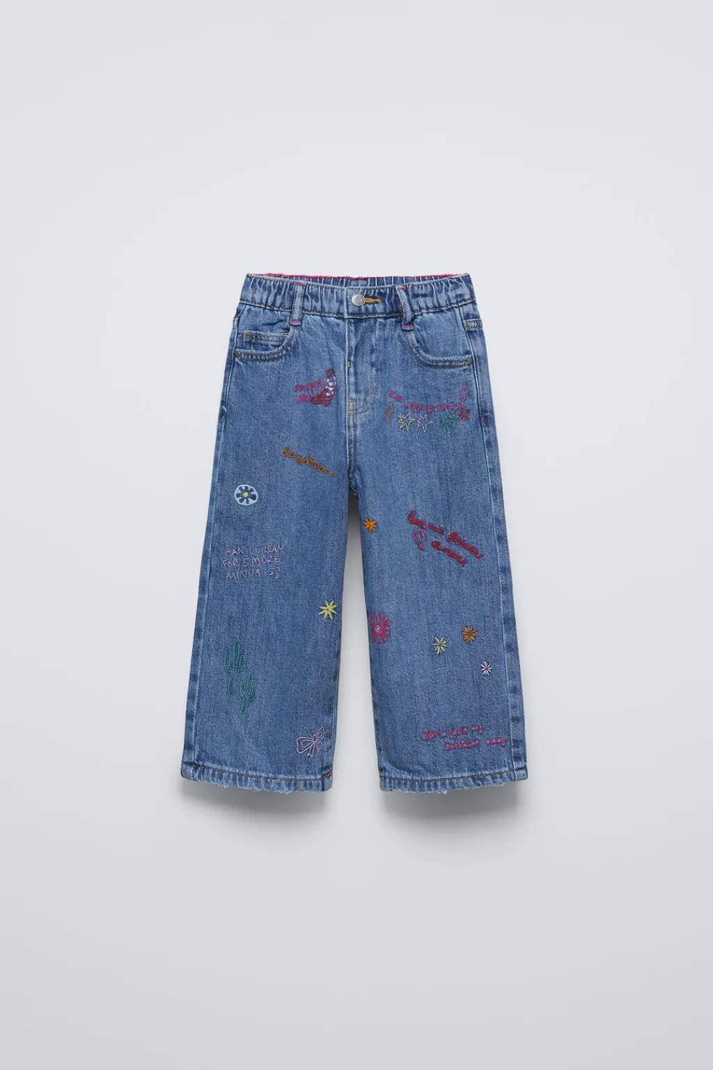 Jeans tipo recto con cinturilla elástica y cierre botón presión frontal. Bolsillos en delantero y de tipo plastrón en espalda. Estampado bordados en delantero.