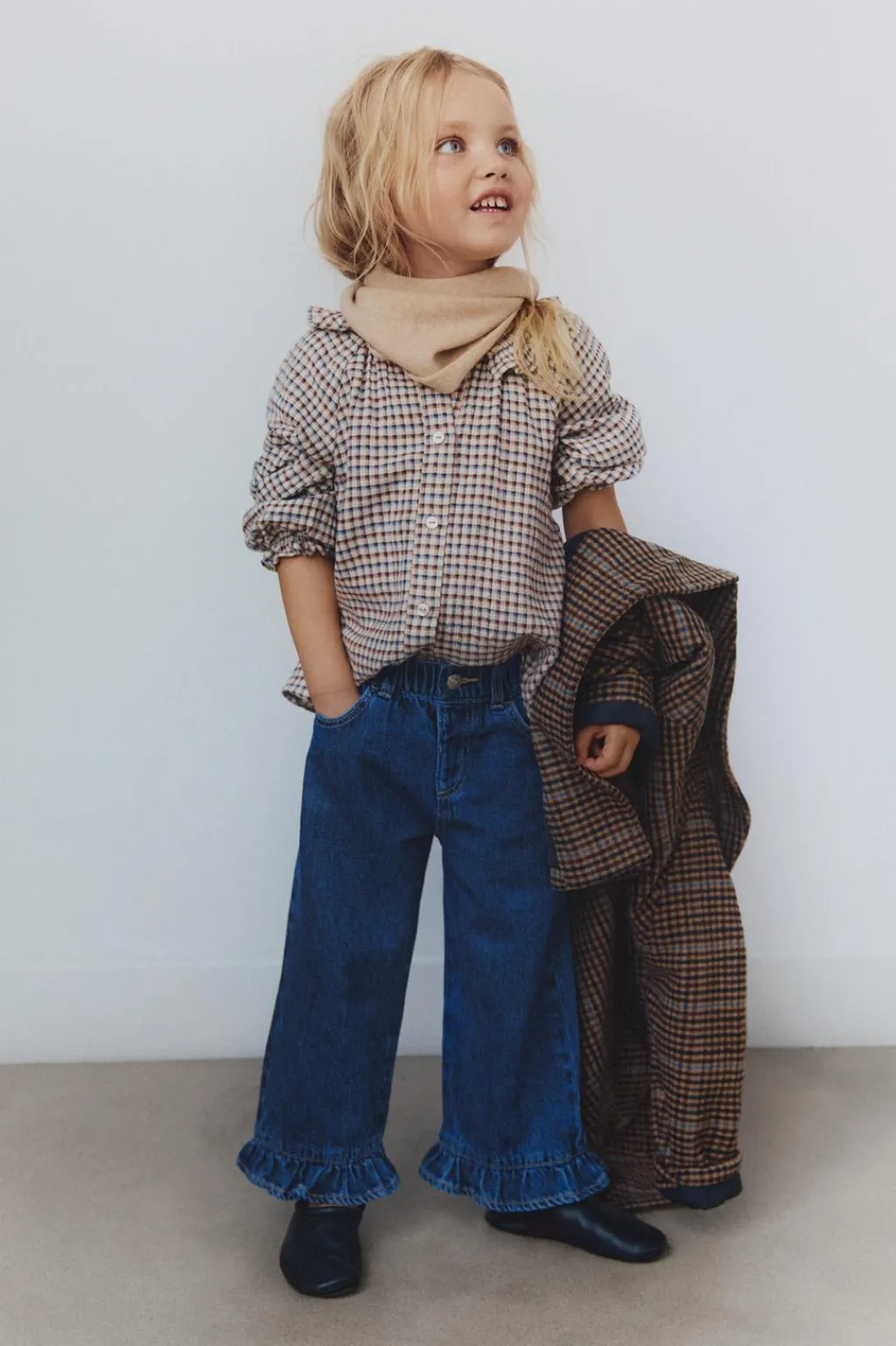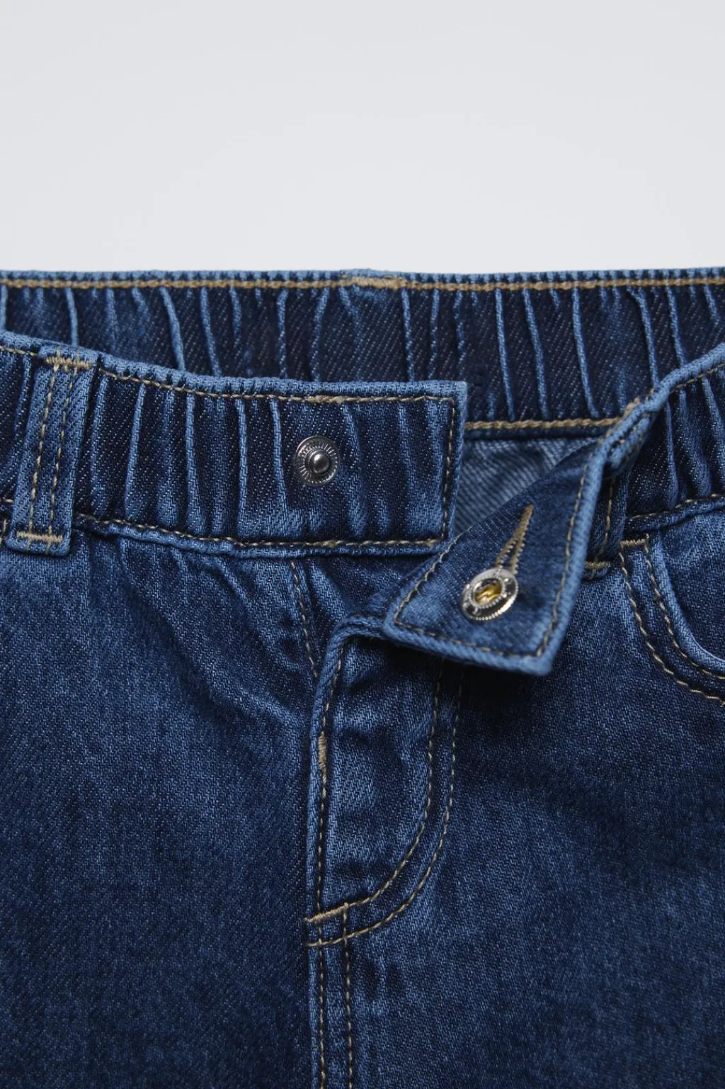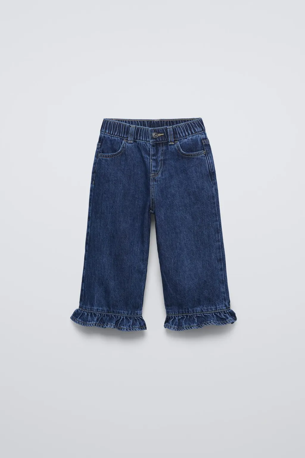 Jeans con cinturilla elástica y cierre botón tipo presión en delantero.Cierre con cremallera a partir de la talla 4. Bolsillos en delantero y de tipo plastrón en espalda. Detalle volantes en bajo.
