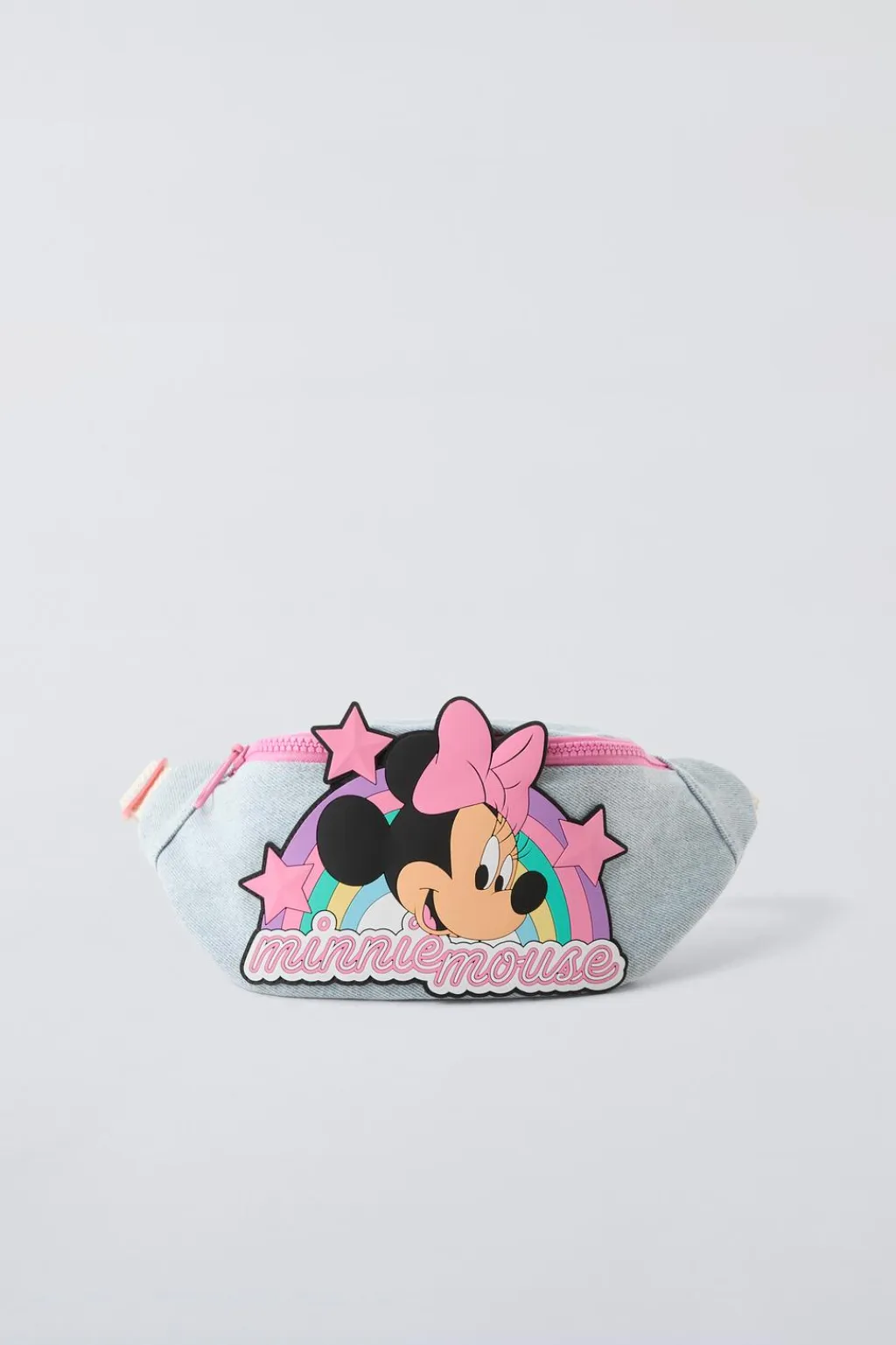 Bolso formato riñonera denim MINNIE MOUSE © DISNEY. Compartimento principal con cierre mediante cremallera. Asa ajustable con cierre mediante clip.