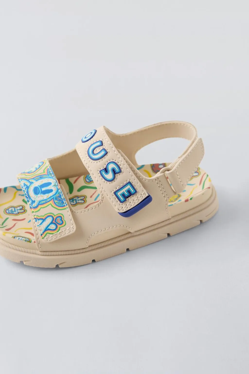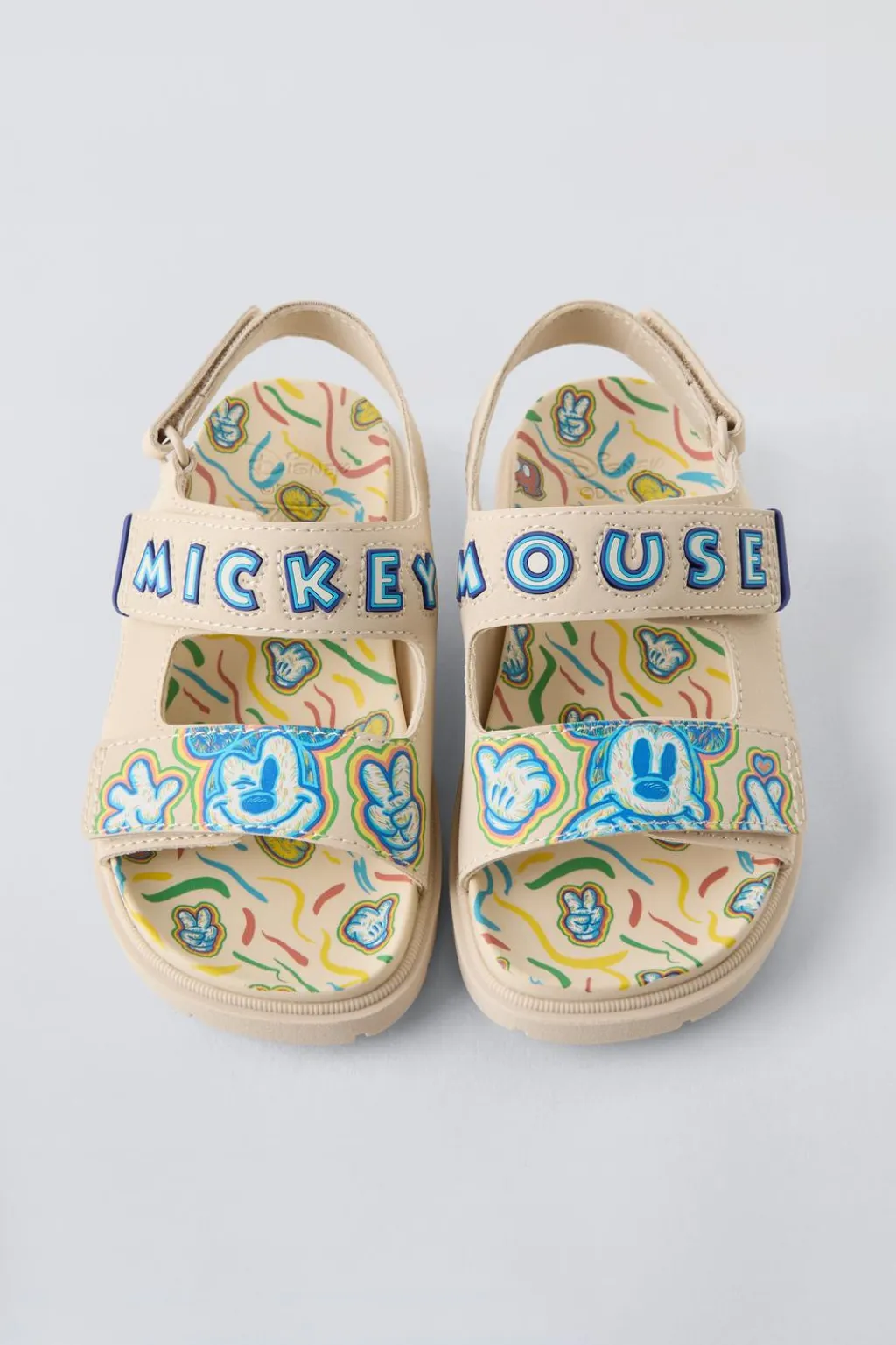 Sandalia engomada MICKEY MOUSE © DISNEY. Cierre mediante doble tira adherente en el empeine y una tira adherente trasera. Suela de goma dentada.