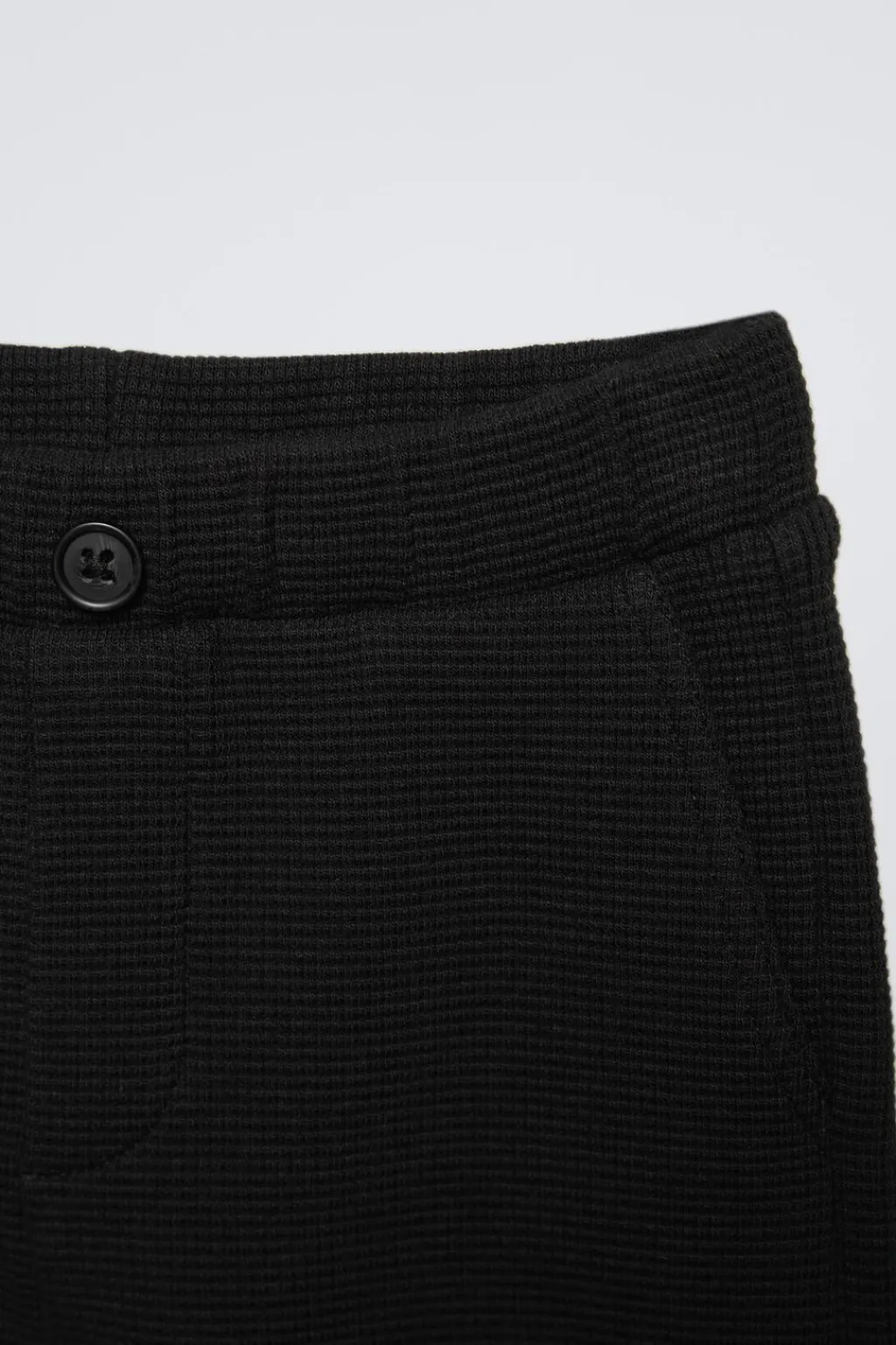 Pantalón con tejido waffle con cinturilla elástica y aplique botón frontal. Bolsillos en delantero.