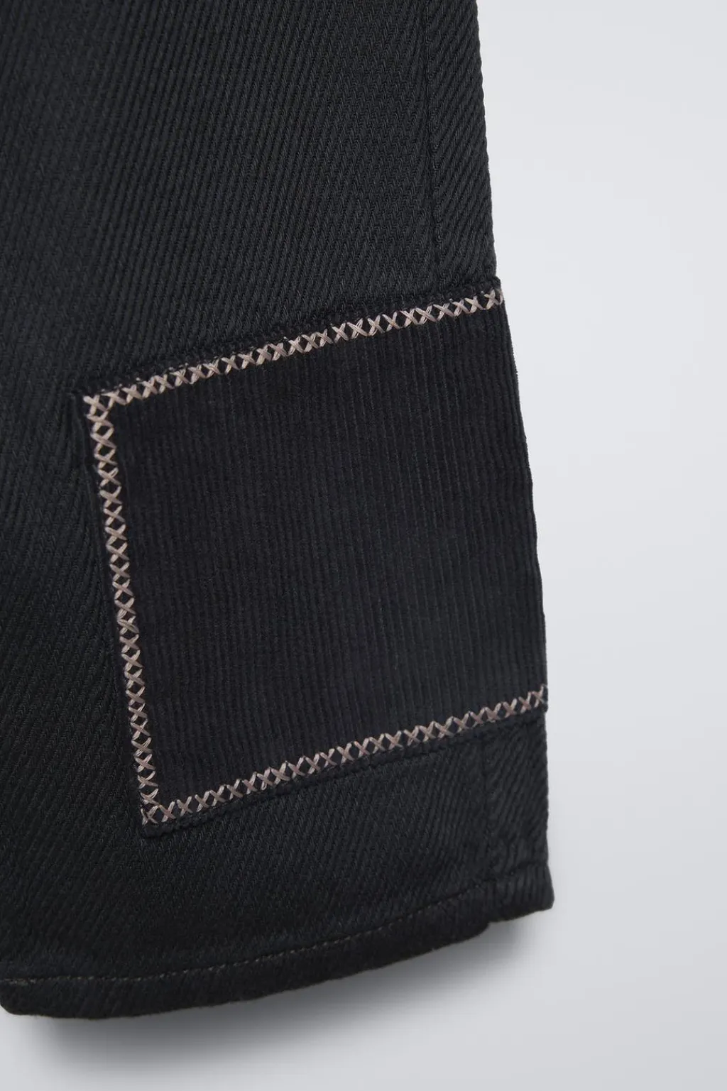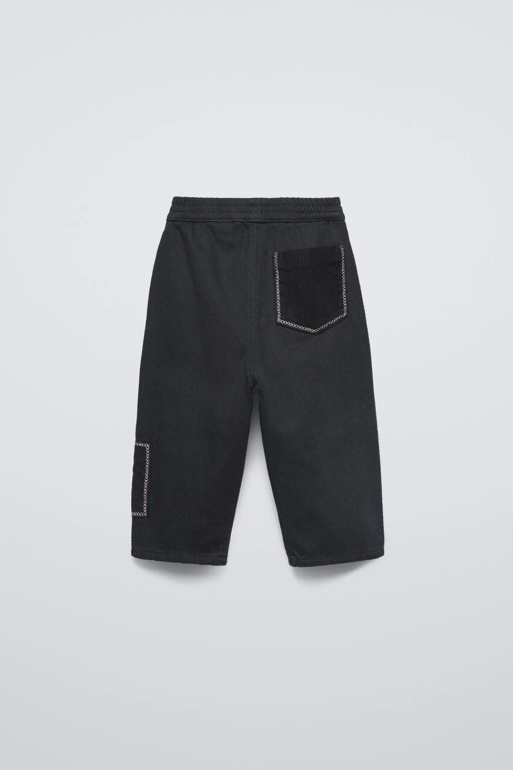 Pantalón con cinturilla elástica. Bolsillo de tipo plastrón en espalda. Apliques en tejido pana.