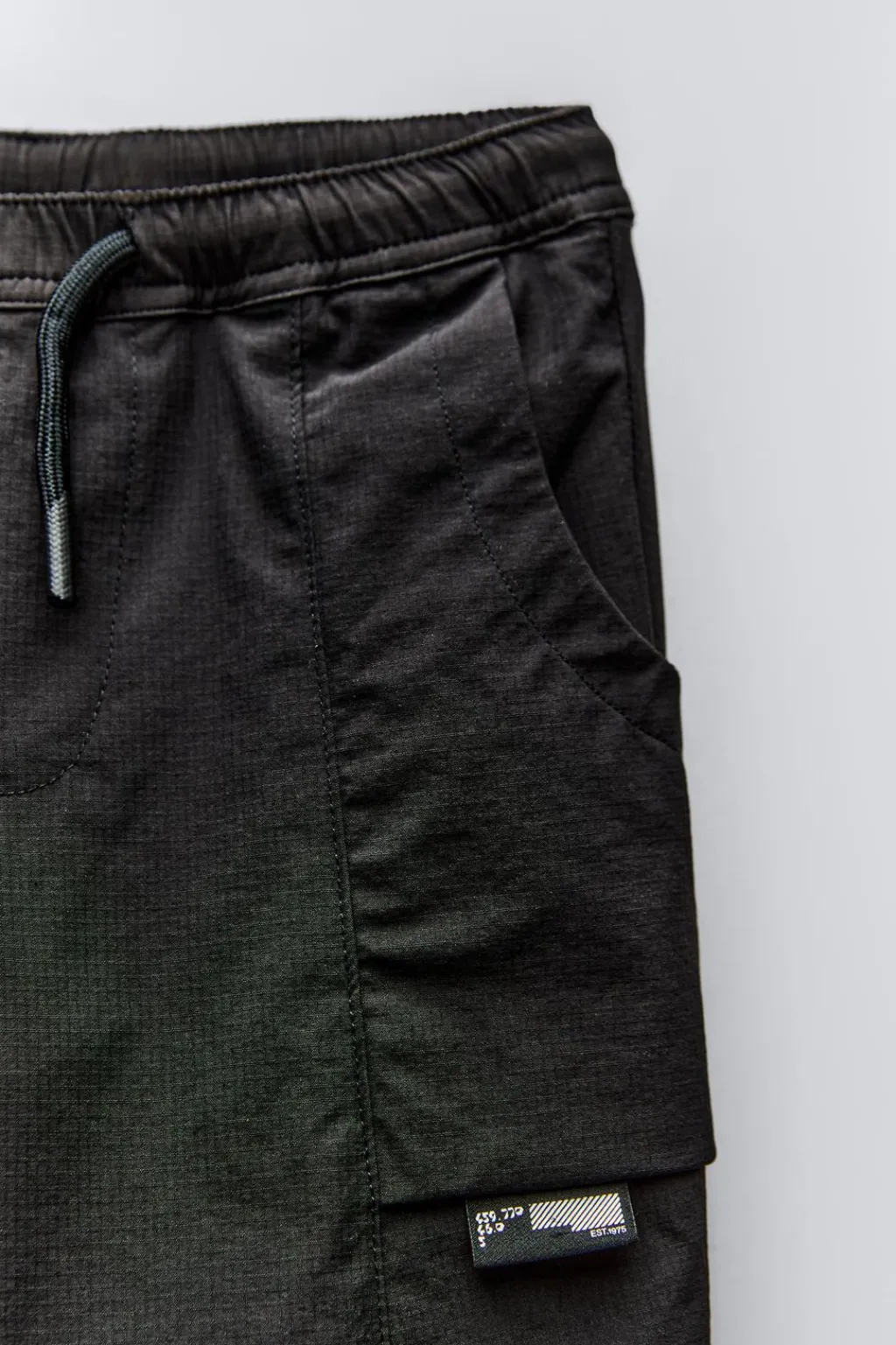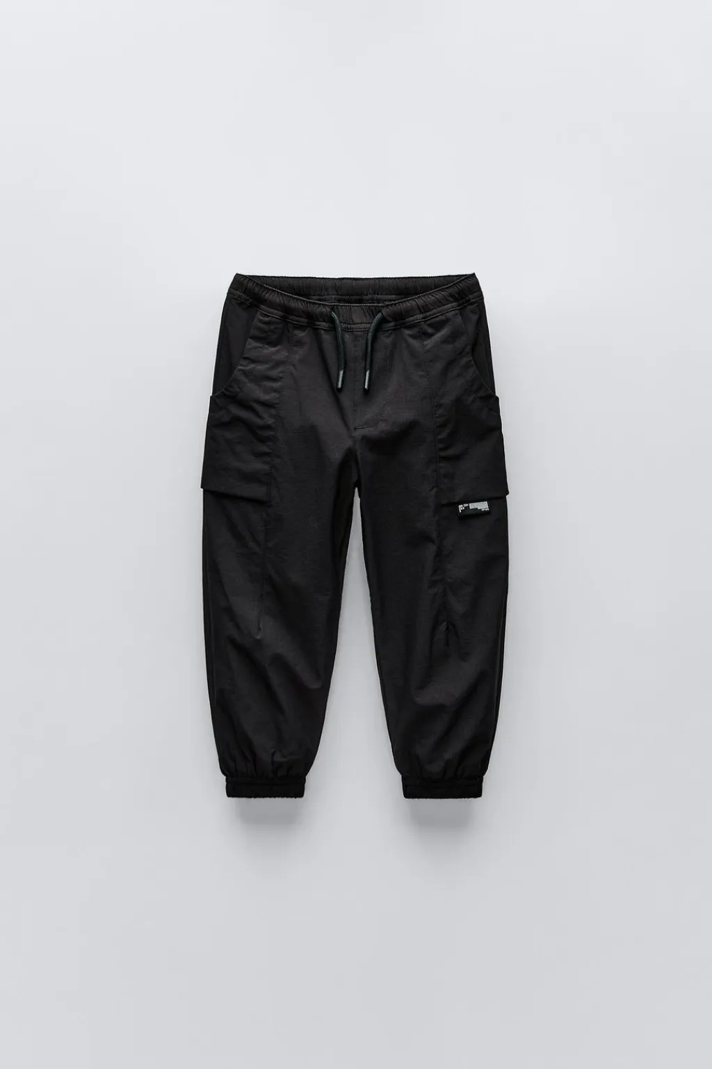 Pantalón tipo cargo con cinturilla elástica y cordones ajustables. Bolsillos tipo plastrón en delantero con aplique etiqueta. Bajo acabado en puño y forro interior.