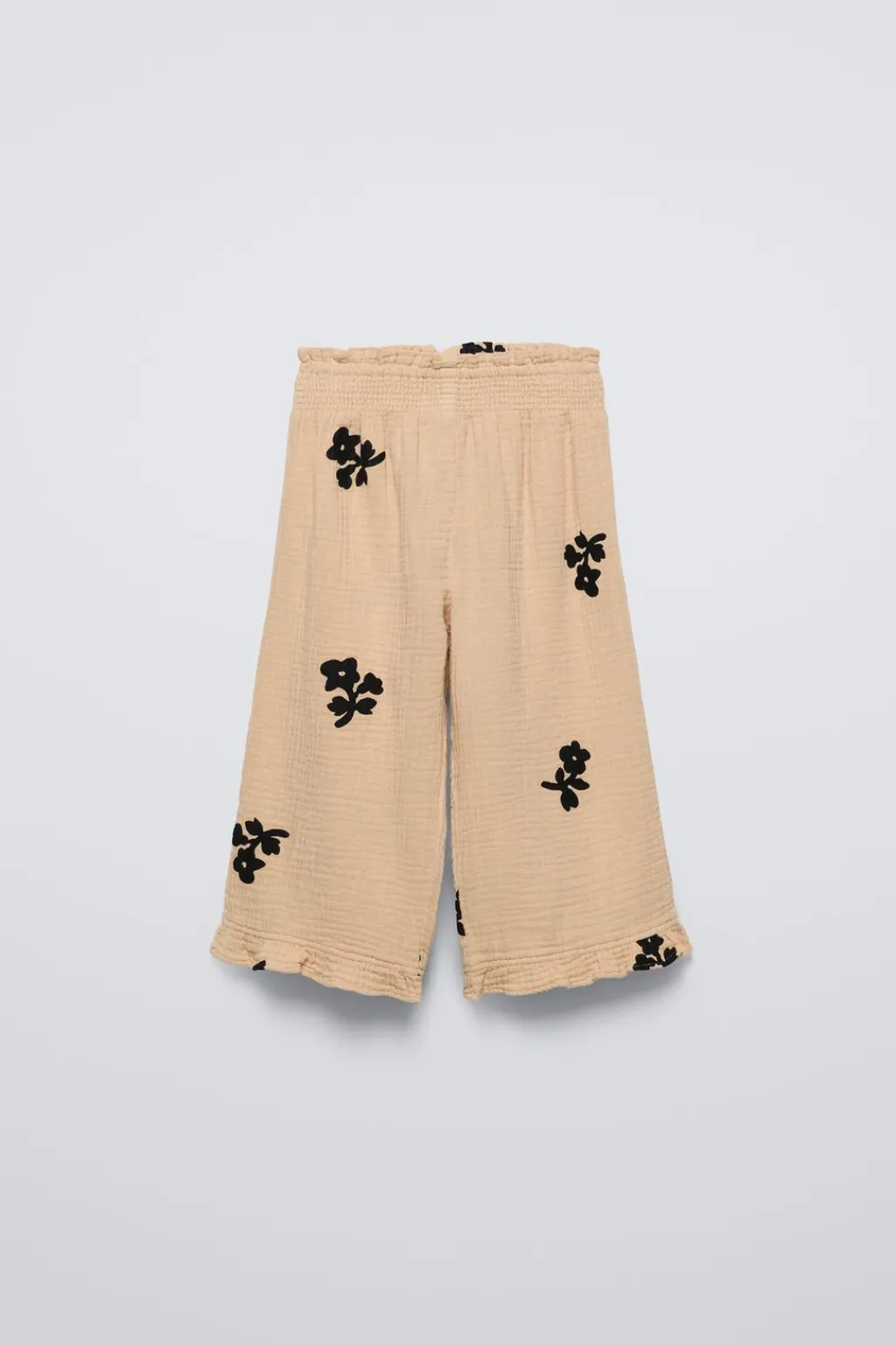 Pantalón con cinturilla elástica. Bajo acabado en volantes.