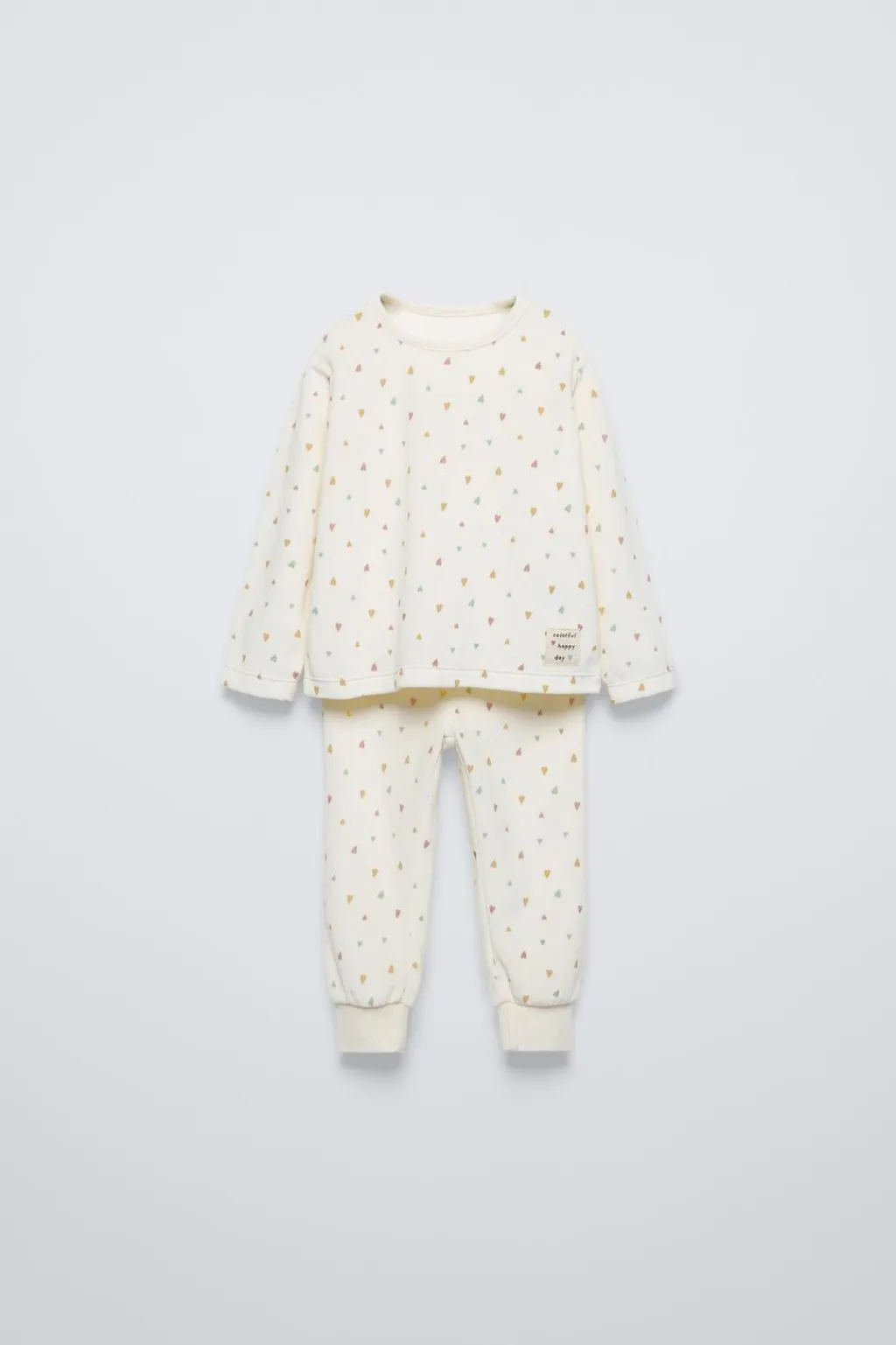 Pijama dos piezas. Camiseta con cuello redondo y manga larga. Aplique etiqueta en bajo. Pantalón con cinturilla elástica. Bajo acabado en puño.