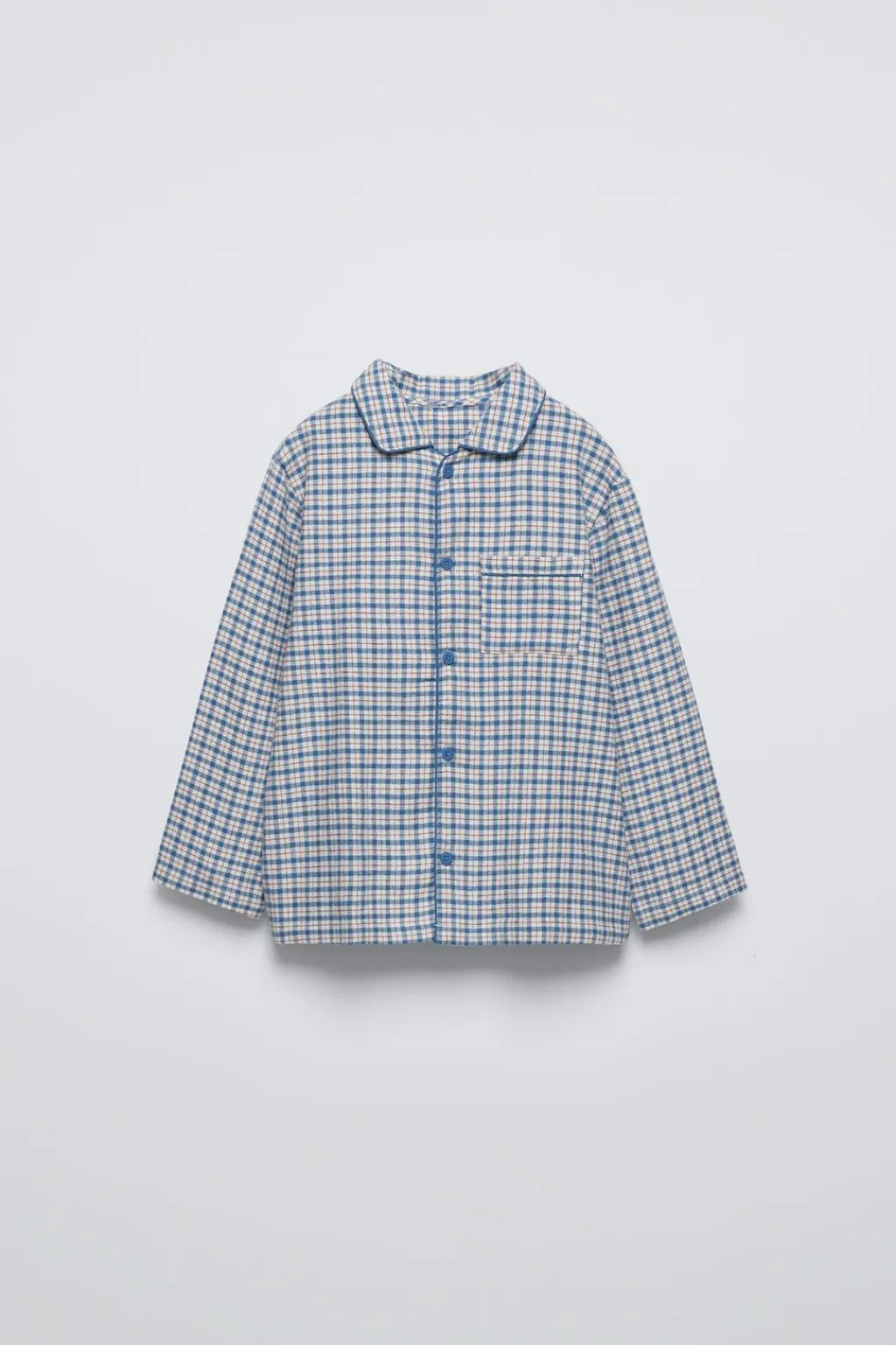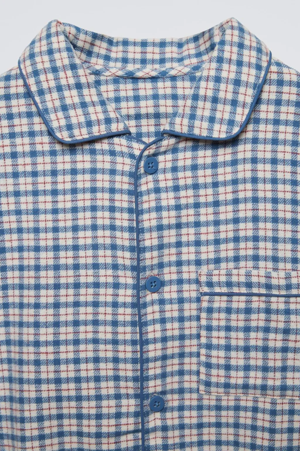 Pijama dos piezas. Camisa con cuello camisero y manga larga.Cierre botonadura frontal. Bolsillo tipo plastrón en pechera. Pantalón con cinturilla elástica. Estampado cuadros.