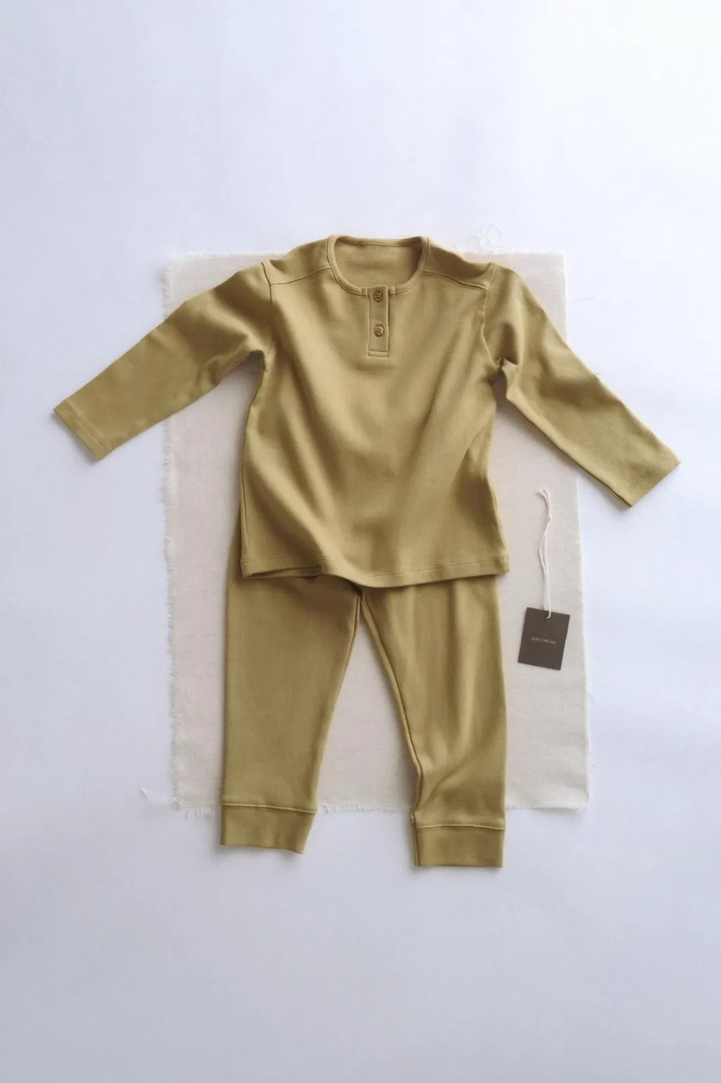 Pijama de dos piezas confeccionado en un tejido con algodón. La camiseta tiene el cuello panadero con botones a tono. El pantalón tiene la cinturilla elástica para dar comodidad.