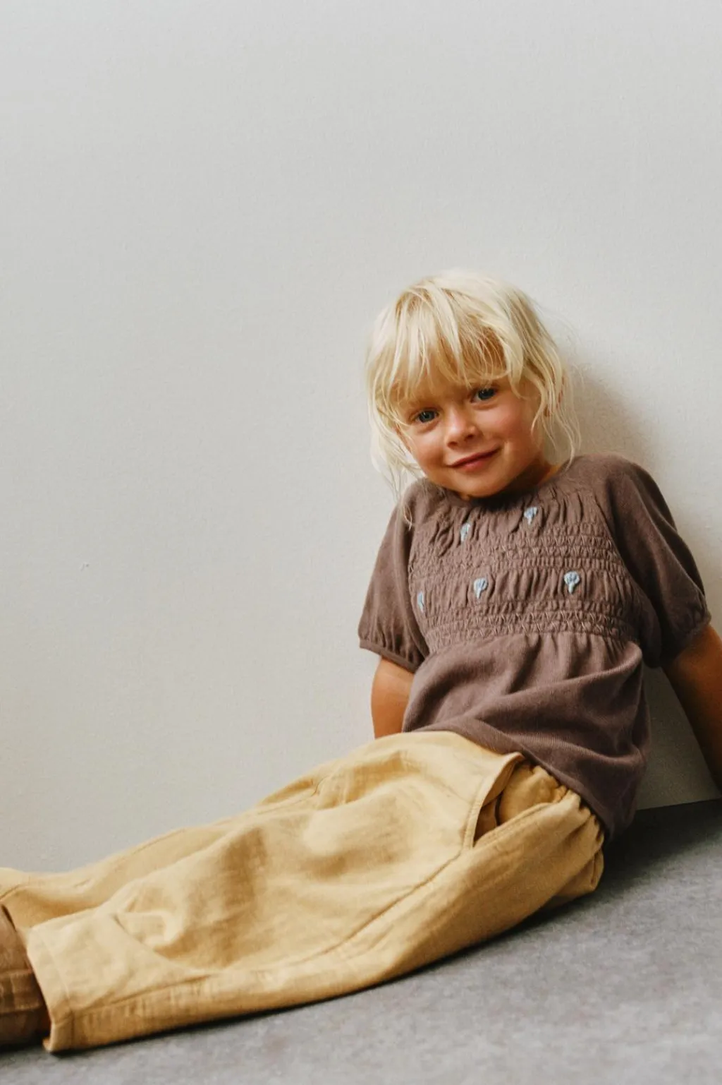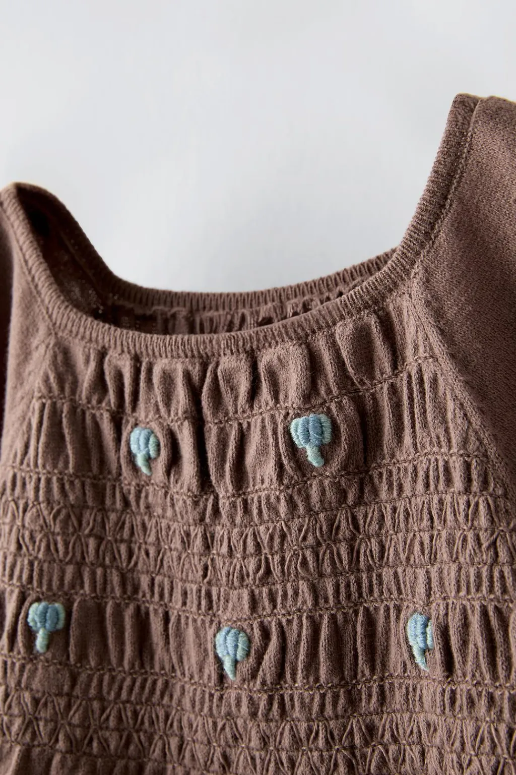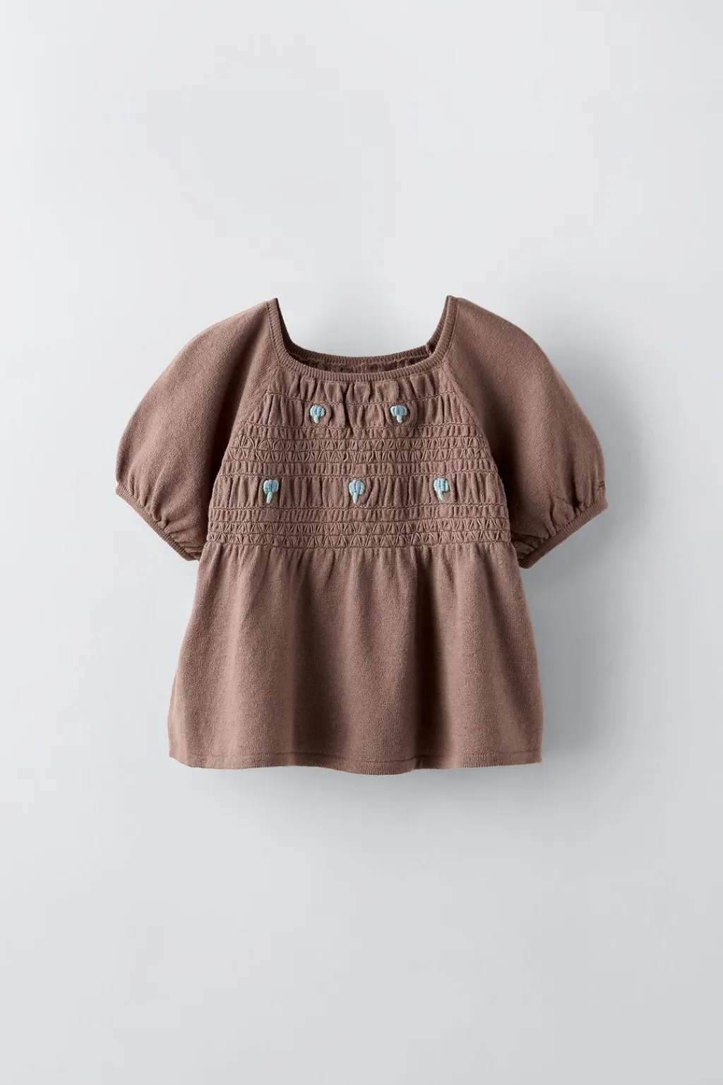 Top con cuello redondo y manga corta. Detalle bordados en pechera con nido de abeja.