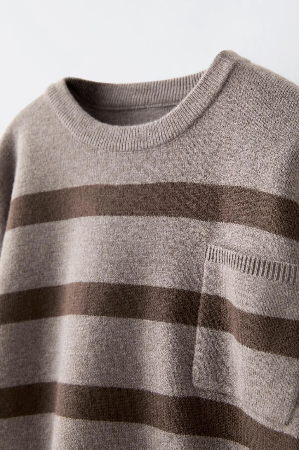 Jersey con cuello redondo y manga larga. Bolsillo de tipo plastrón en pechera. Estampado rayas.
