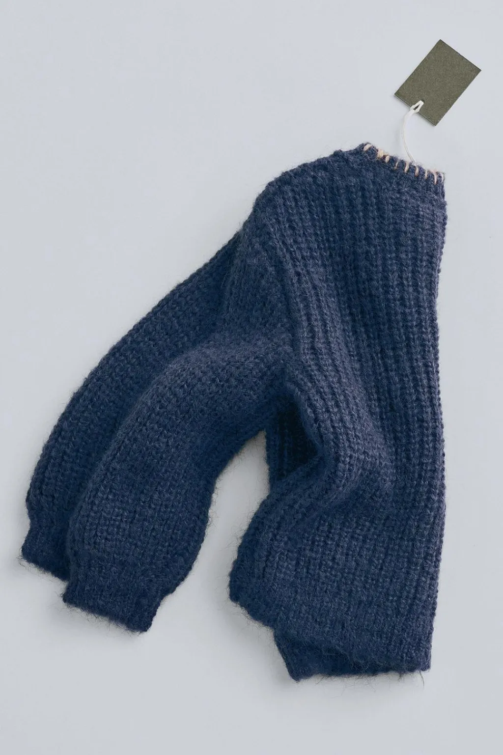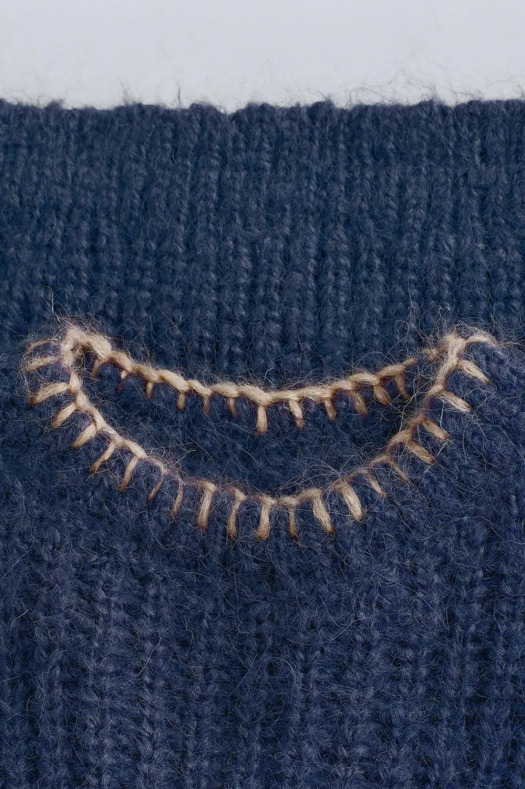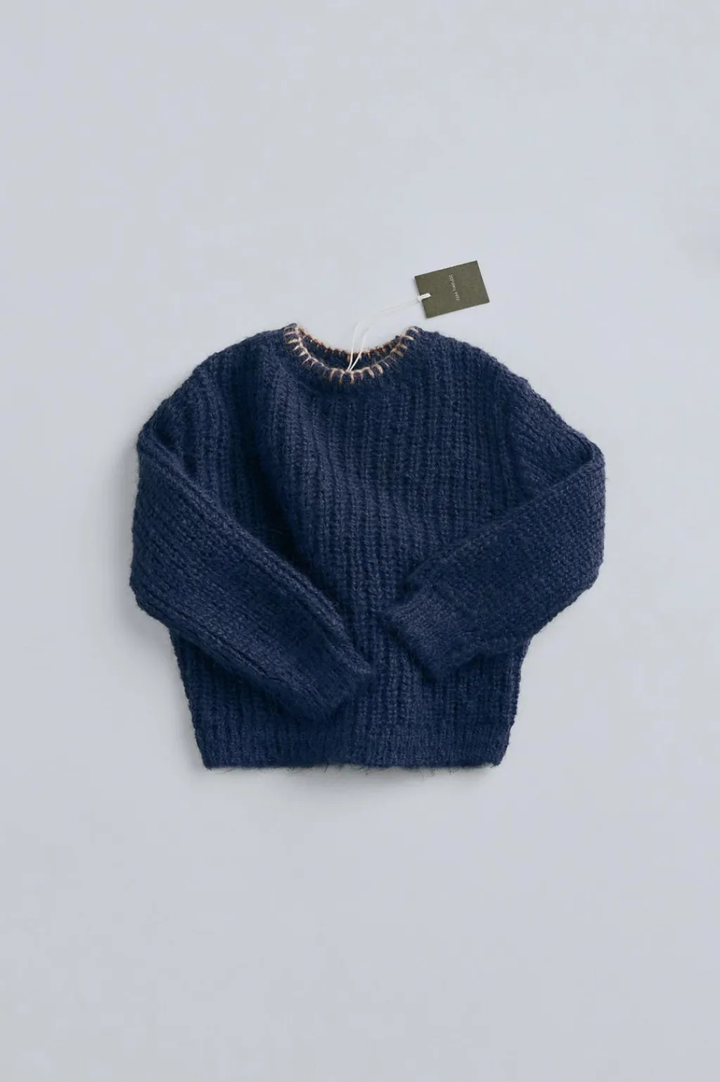 Jersey de punto grueso con lana y fit relajado. Como detalle tiene unos pespuntes de color a contraste en el cuello.