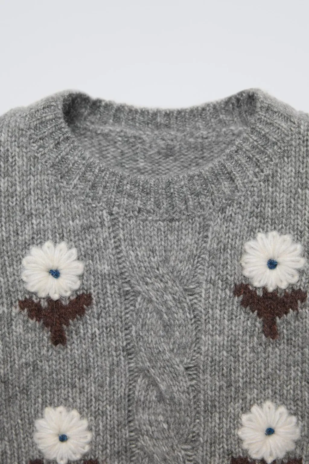 Jersey de. punto con cuello redondo y manga larga. Detalle flores bordadas en delantero y mangas.