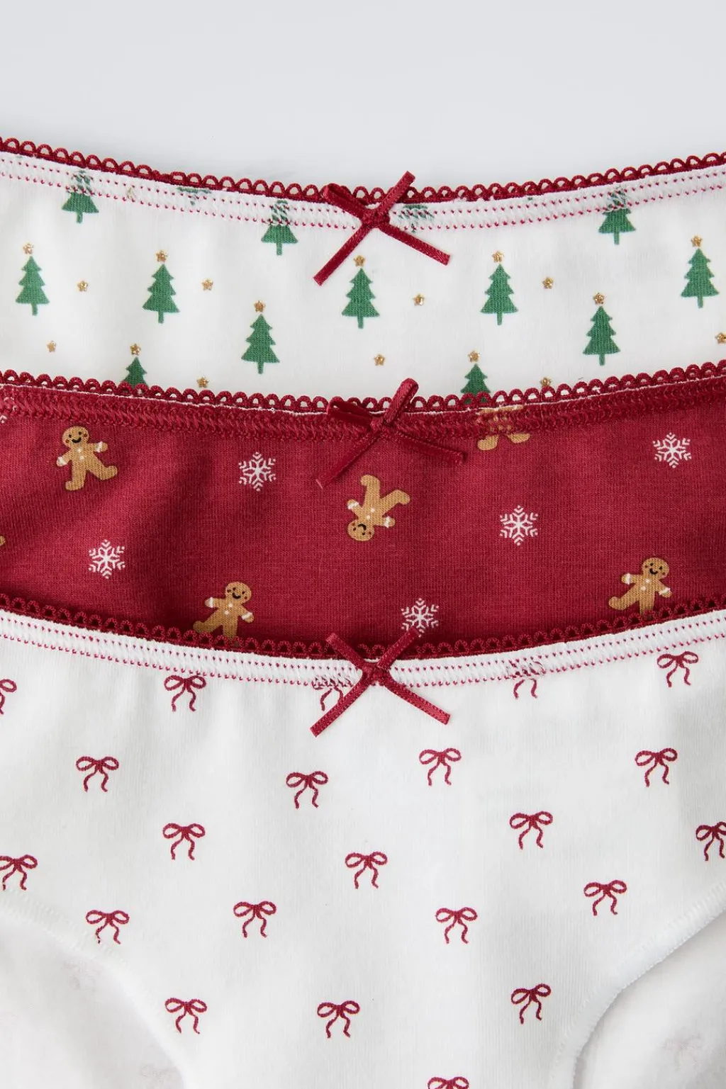 Pack de tres braguitas con cinturilla elástica y aplique lazo frontal. Diferentes estampados.