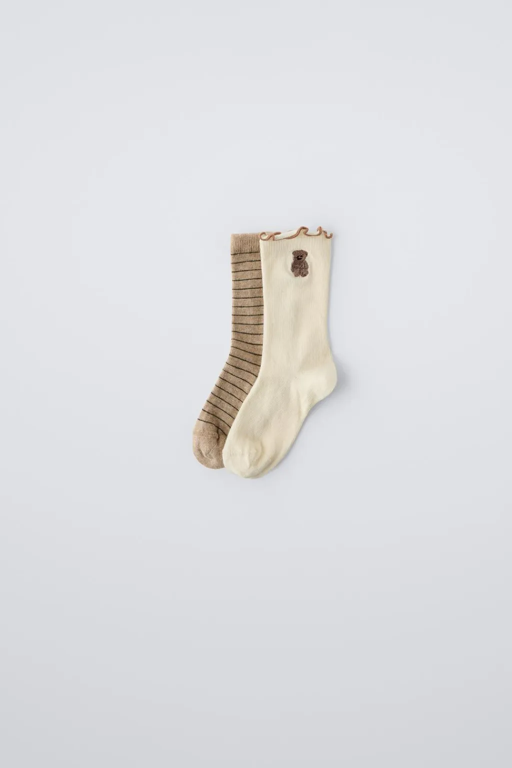 Pack de dos calcetines largos acabados en rizo. Detalle bordado osito y estampado rayas.
